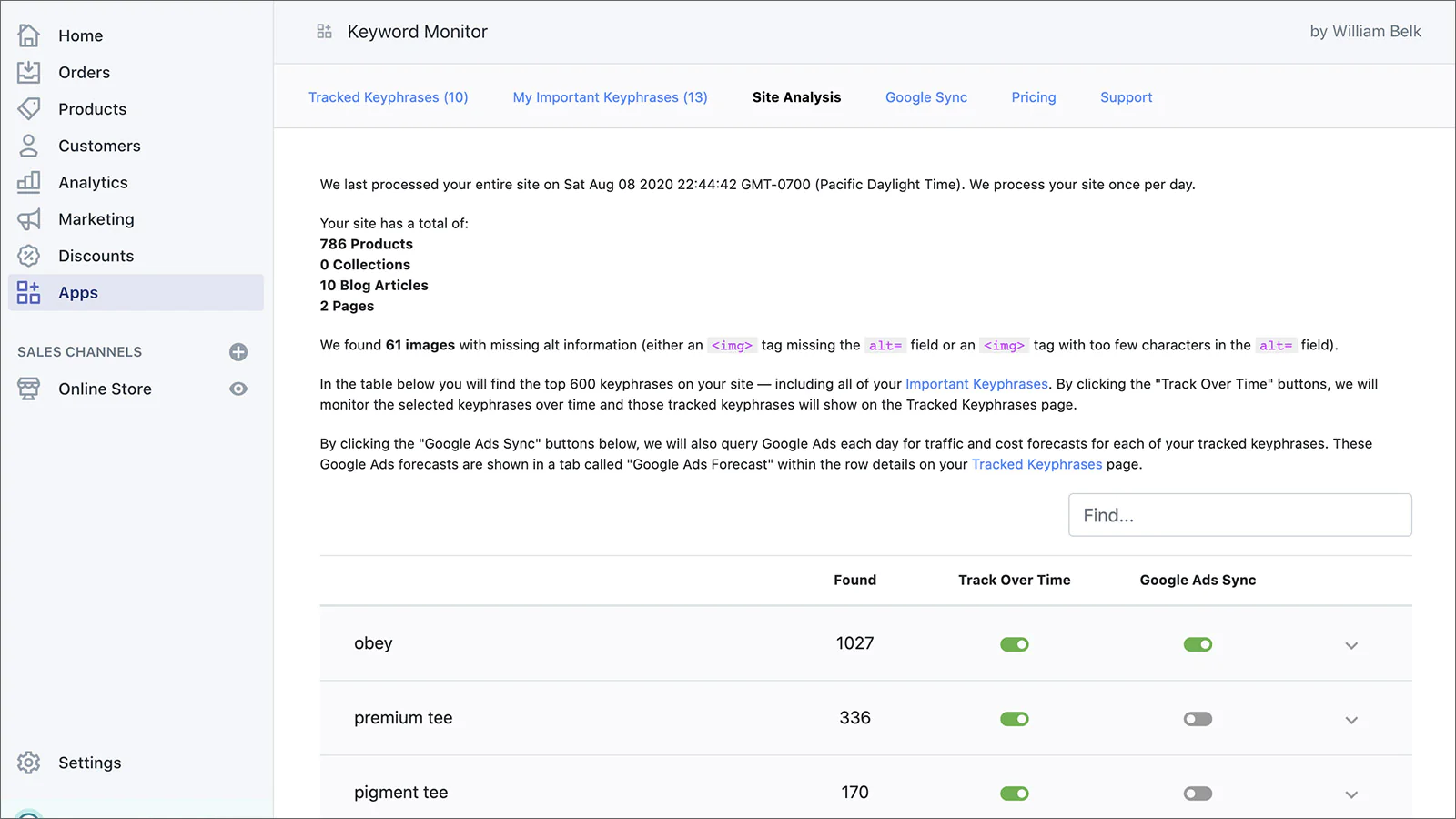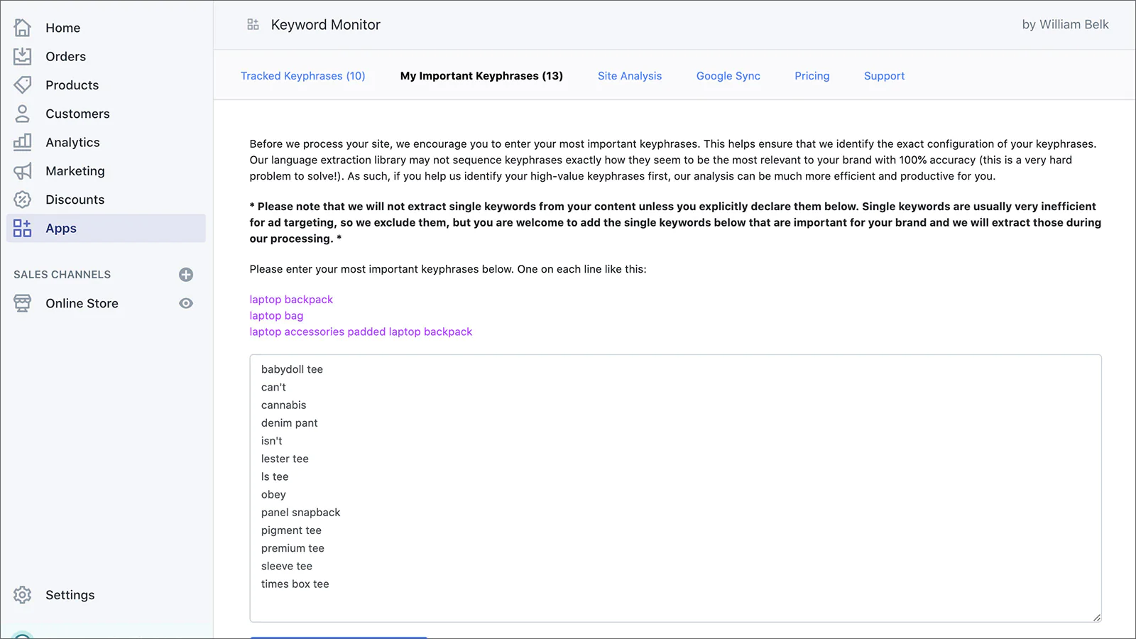 This is the only app that extracts your top 600 important keywords and keyphrases from every page of your Shopify site (Products, Collections, Articles, and Pages). We use sophisticated natural language processing to identify multi-word kephrases in your content.