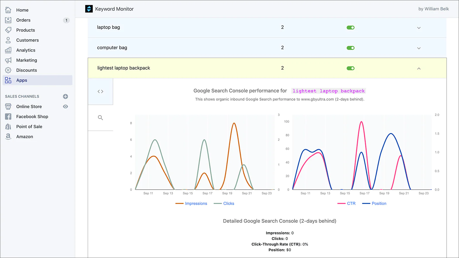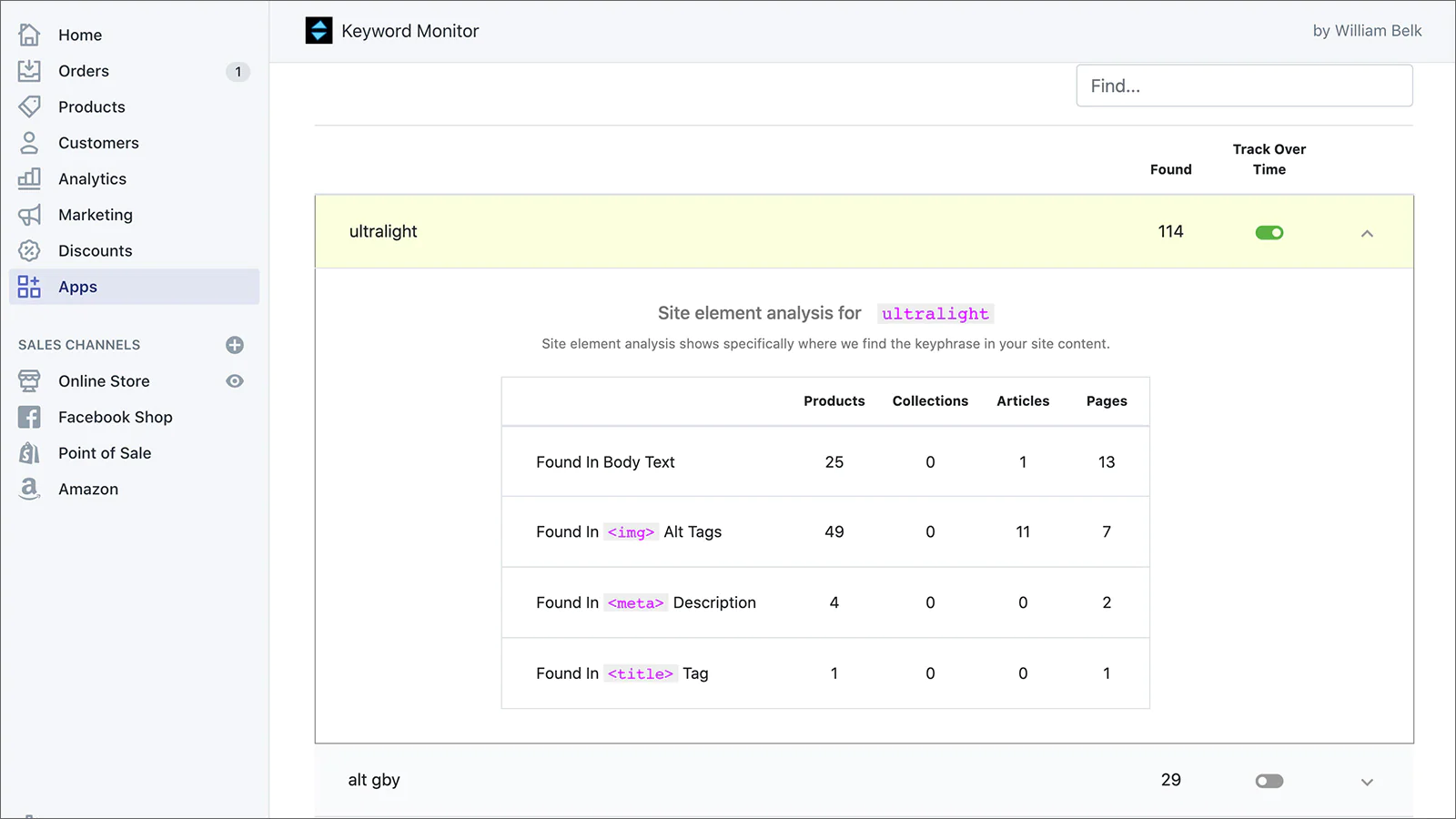 Keyword Monitor brings new levels of transparency, accountability and reporting to your content creation and SEO initiatives. Most content developers and marketers work backwards from Google Search Console in order to paint a picture about their keyword and keyphrase content, and its performance over time. Keyword Monitor for Shopify allows you to monitor the exact amount of keyphrase content on your site, then map those important keyphrases to Google Search Console once you understand how much keyword and keyphrase content actually exists on your site (and its exact location in your code and on your pages).