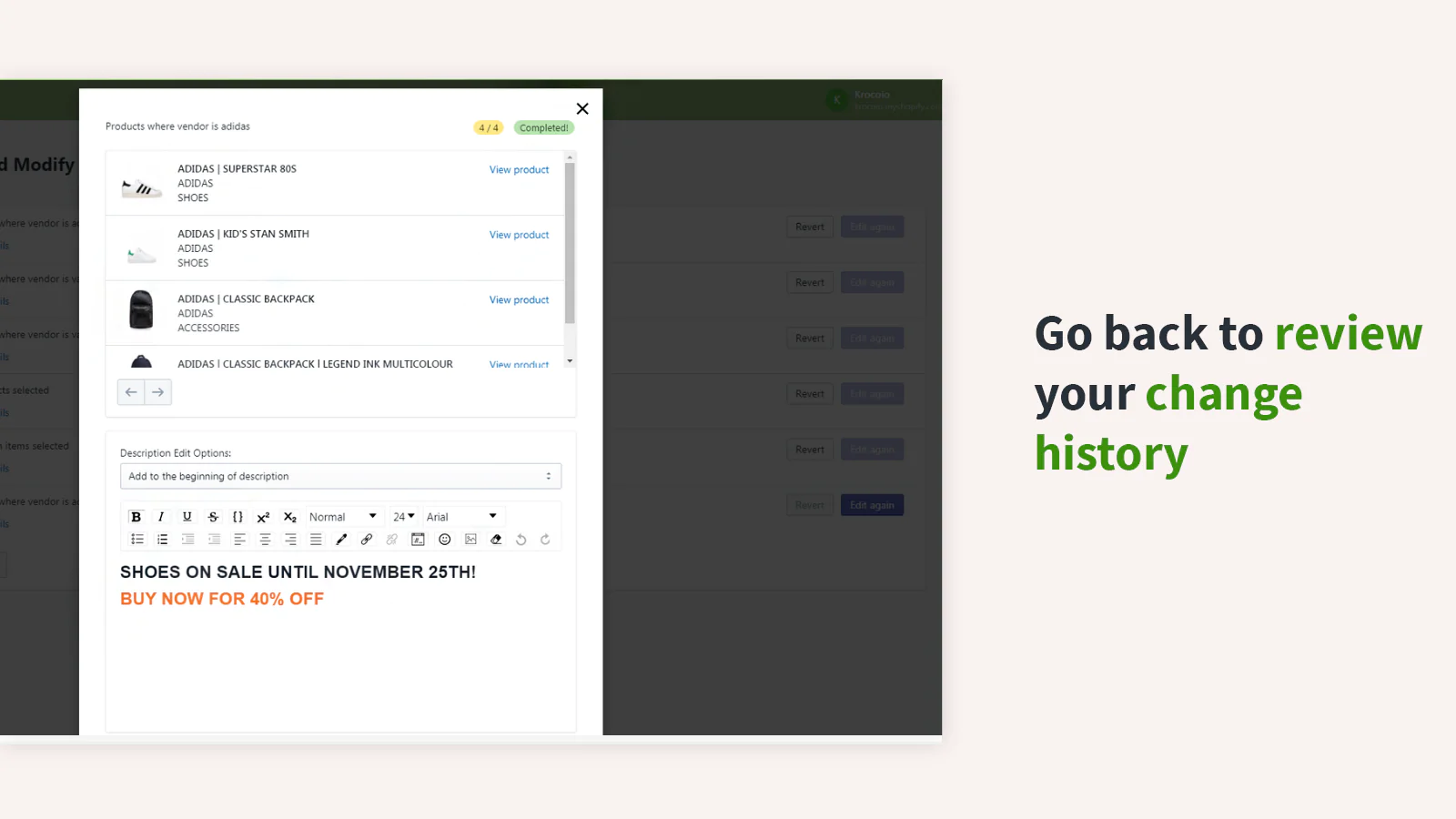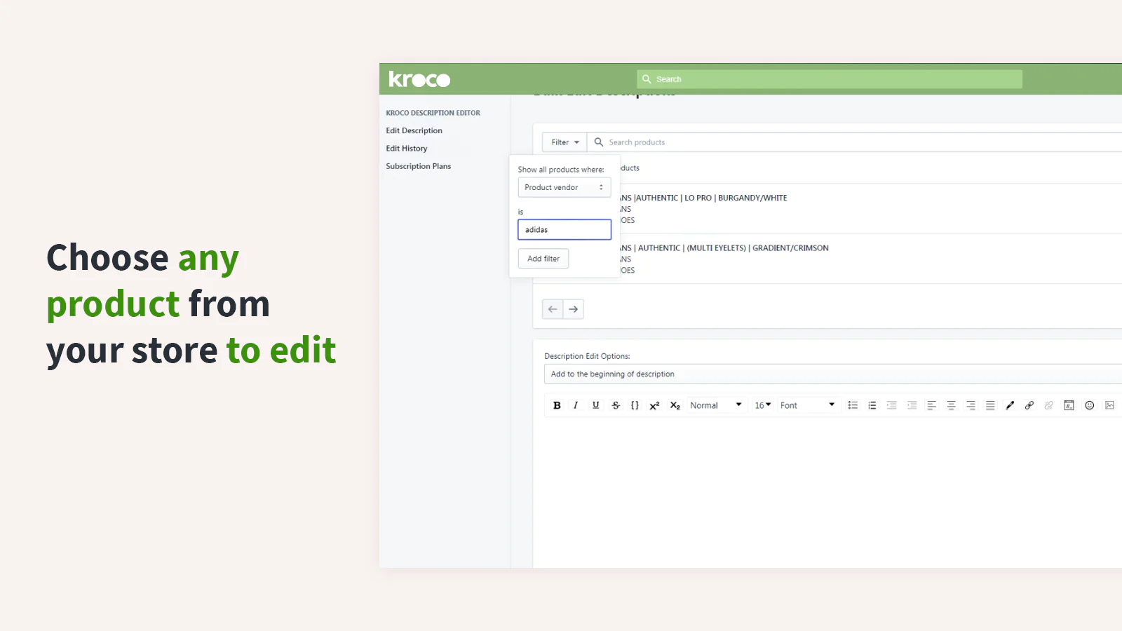 With Kroco Bulk Description Editor, you can drive sales by better keeping your customers in the loop with up-to-date descriptions for all of your Products -- no coding knowledge or developer required.