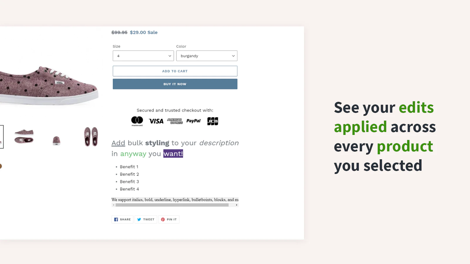 Text styling without HTML. : Our bulk description editor let's you edit font sizes, font colors, hyperlinks, lists, and much more.