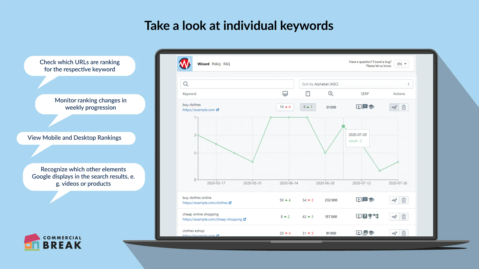 Use Kwrds to see at first glance what weekly ranking changes your site has experienced for the selected keywords. The graph shows you which keywords landed a higher or lower rank than the previous week. You will not only see the domain, but also the specific URL that ranks for your keyword. In addition, you will be shown an overview of your ranking changes and positions every week.