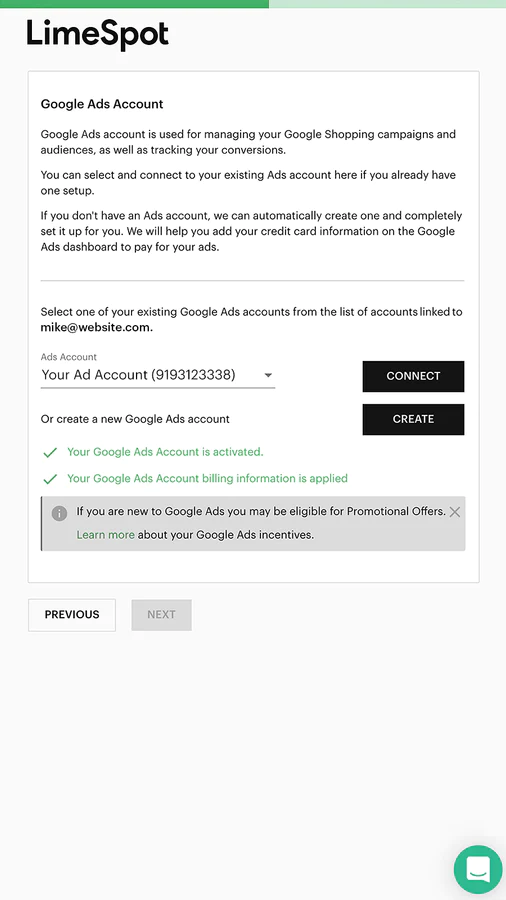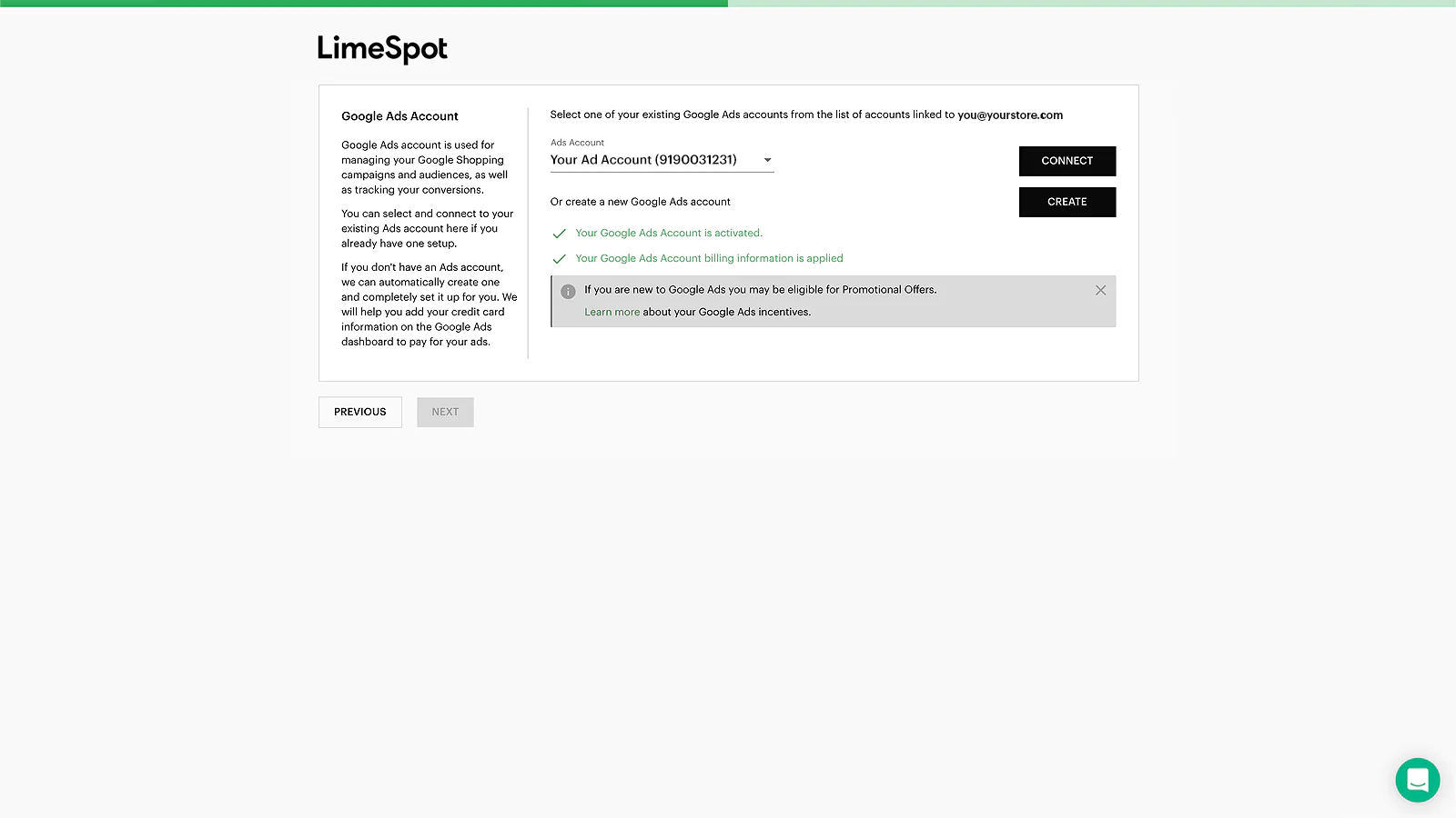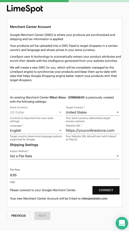 Our Setup wizard helps you easily create or connect to your existing Google Merchant Center and Ad Accounts in a few clicks.