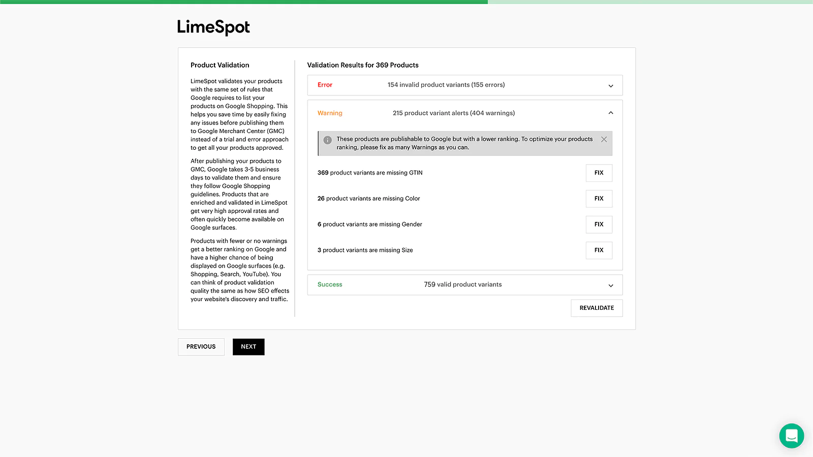 Getting your products approved on Google can be challenging. LimeSpot validates your products & helps you fix them before publishing to Google. This provides an average of 95% product approval across our clients.