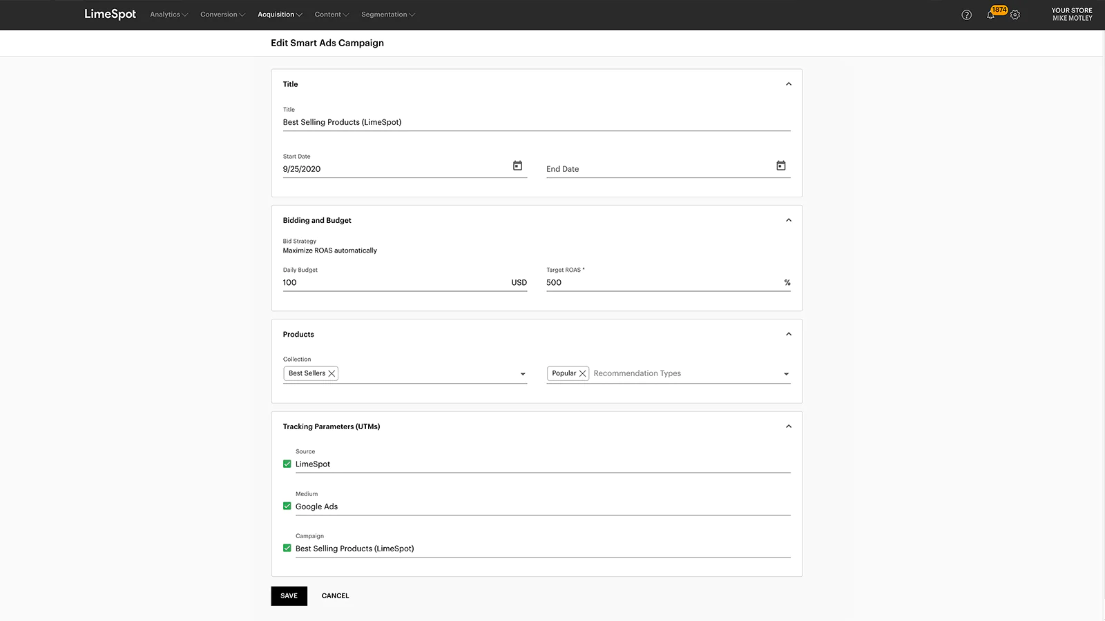Create Shopping Campaigns enriched with your customer behavioral data. You can manually select the products for each campaign or let LimeSpot dynamically assign based on your store behavior (e.g. Most Popular, Trending or New Arrivals). Your campaigns are continuously synced with latest details, and will show the right products to the right person at the right stage of their journey.