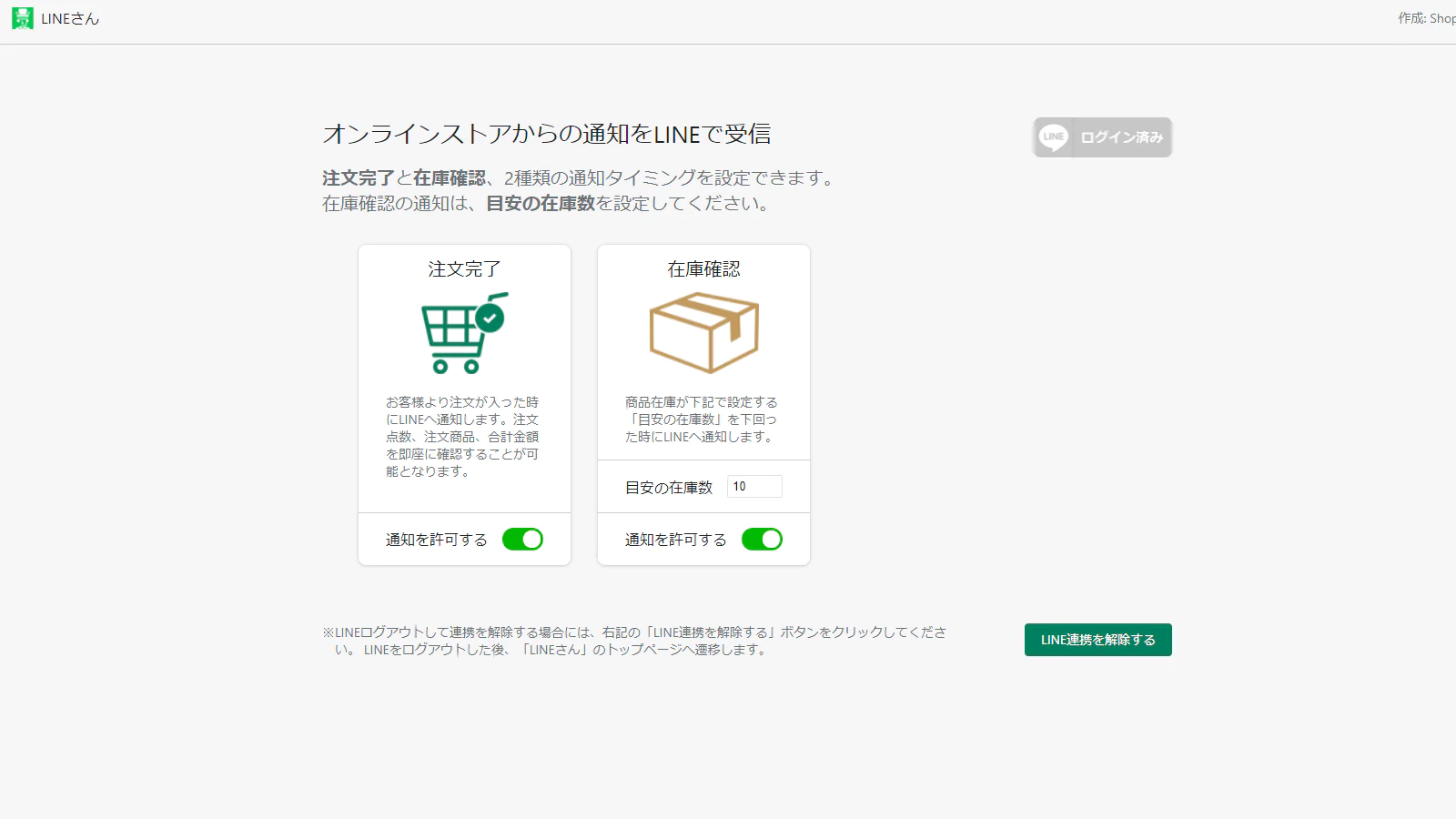 LINE通知のタイミングをカスタマイズ可能 : お客様からの注文を通知する「注文完了」と、商品在庫が少なくなったら通知する「在庫確認」、2つの通知タイミングを設定できます。「在庫確認」は目安の在庫数を設定することで、規定の数より在庫が減った場合にLINEへアラート通知してくれます。