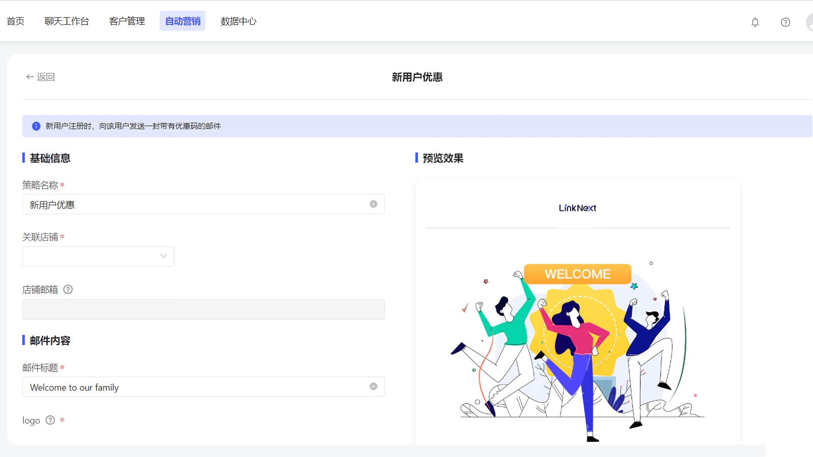 E-mail marketing on an independent site, providing marketing e-mails for new user registration, recall of abandoned orders, and recall of abandoned products