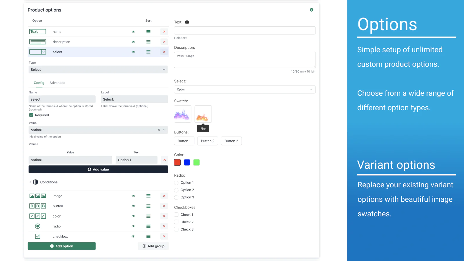 Unlimited Product Options : Add options price add-ons. Show options with conditional logic based on customer selections.