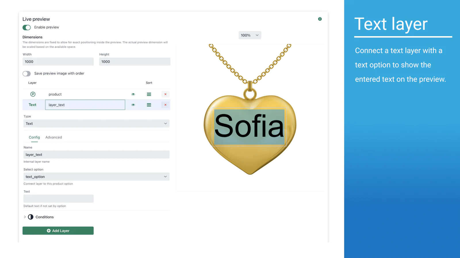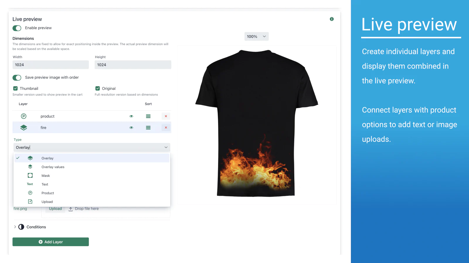 Live Preview : Let customers preview options live on the Product page. Show image uploads & text inputs on the Product image.
