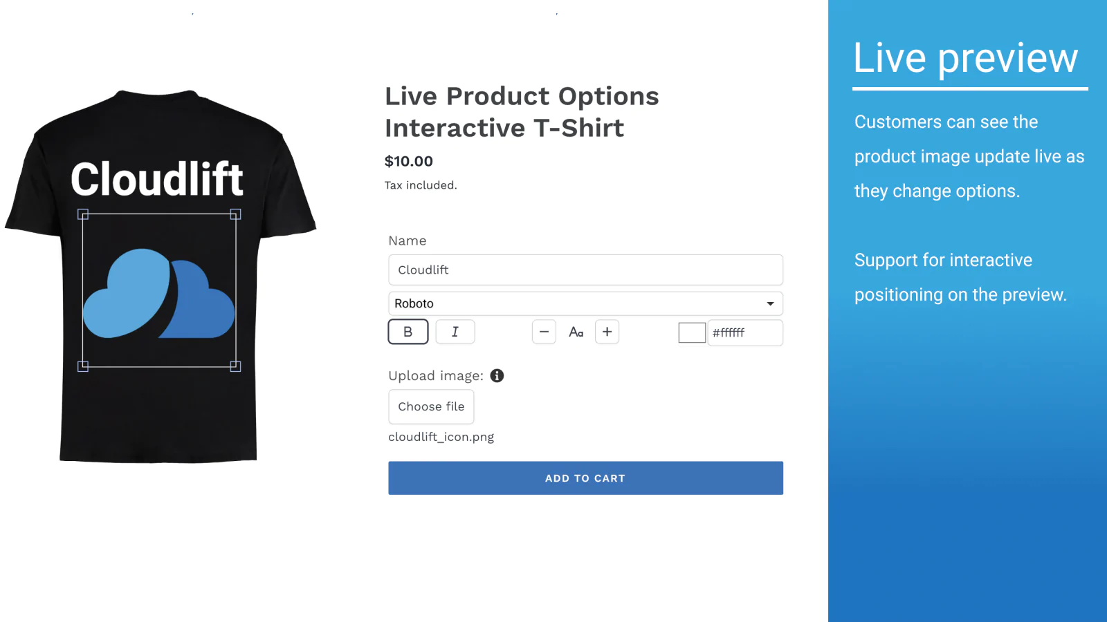 Personalize your products with custom text inputs and image file uploads. Show a live updating preview of the product image with the customers inputs.