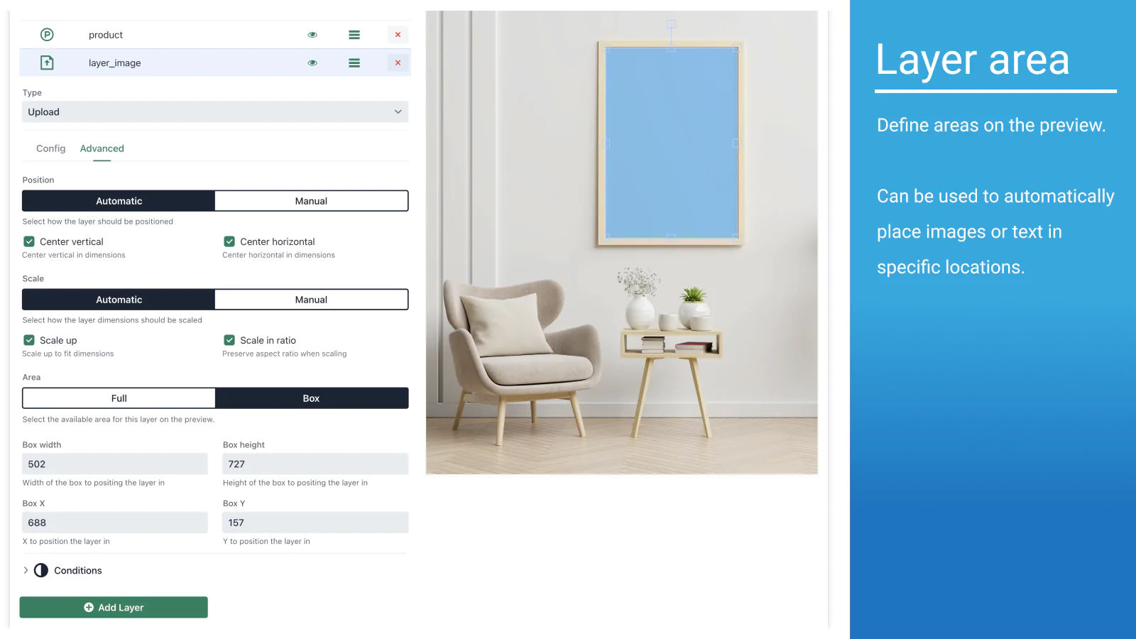 Create custom product configurations with the simple to use visual editor inside the app. Configure specific areas for customers to add text or image uploads.