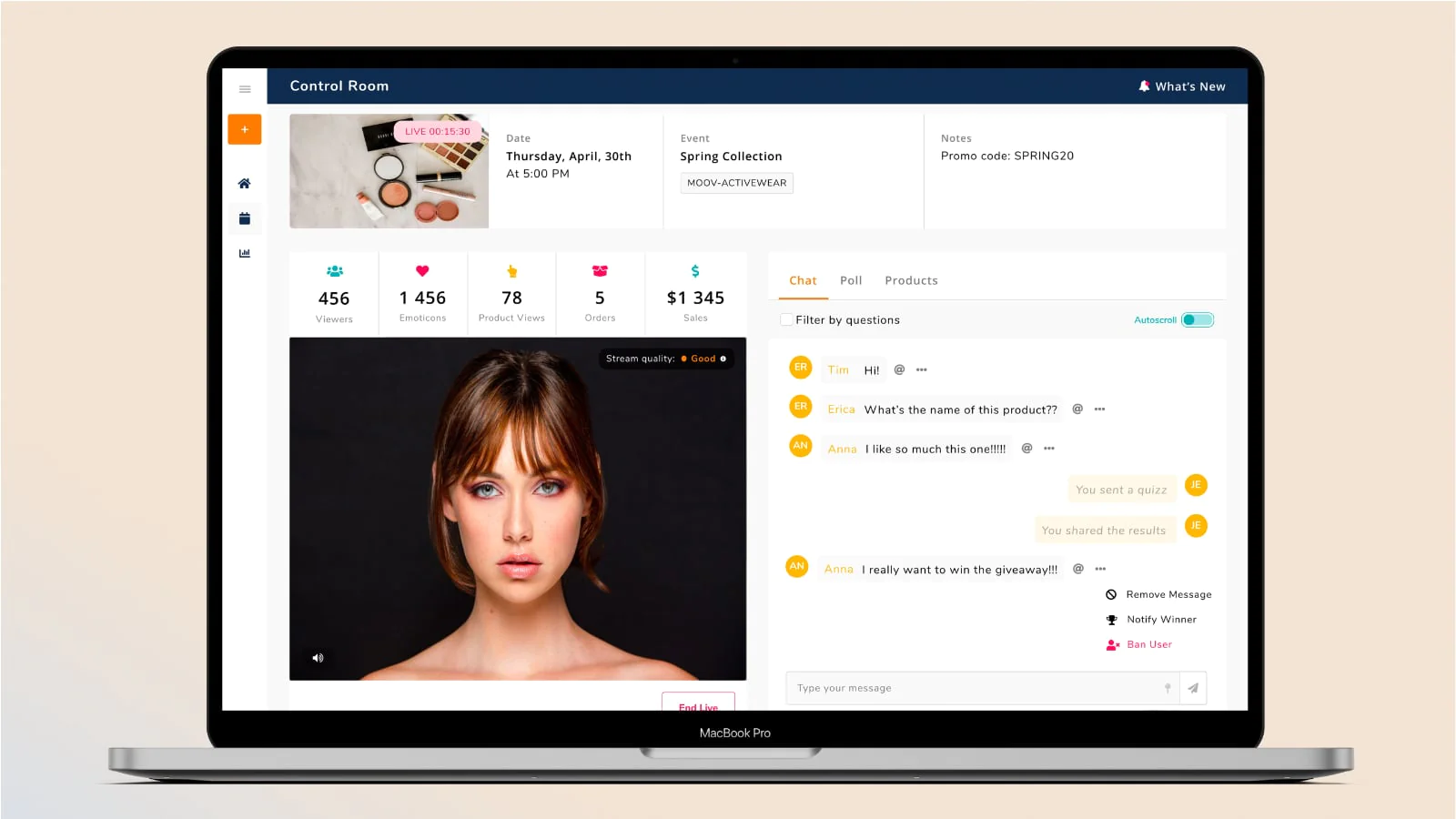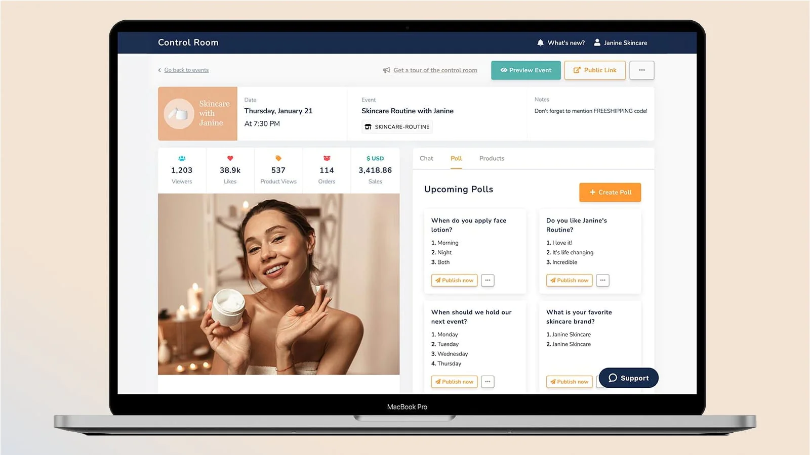 Once you download Livescale, you’ll have full access to our self-service dashboard, where you’ll have full control over how your brand looks and feels. Determine your event frequency, host, and which products you’d like to sell live, all at the touch of a button.
