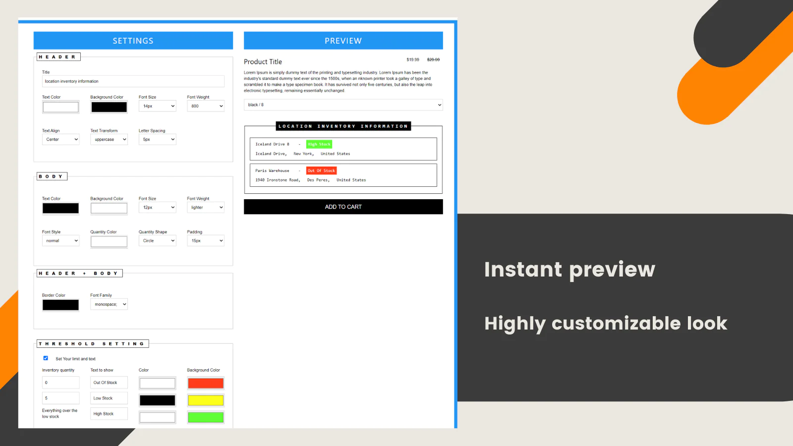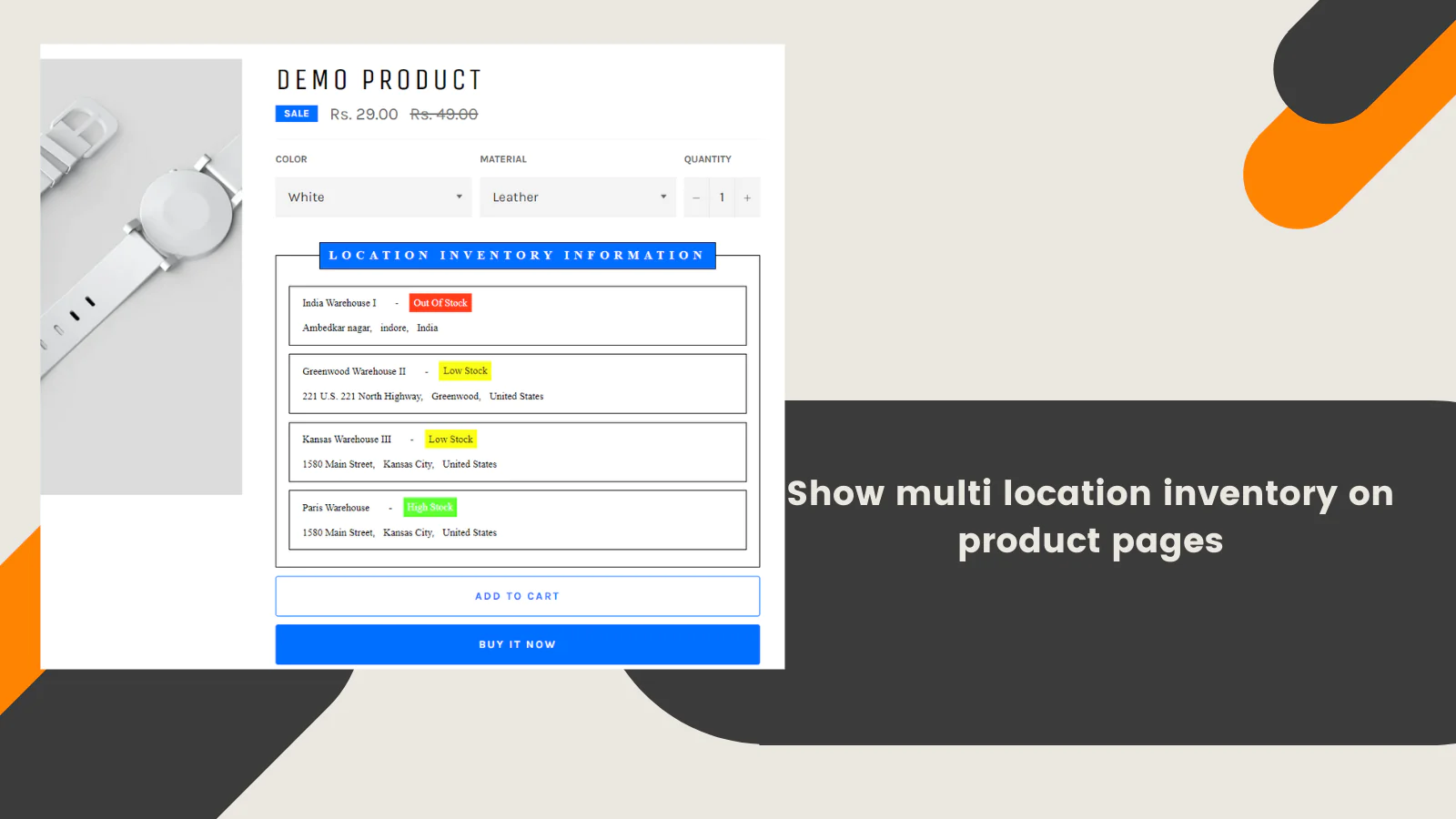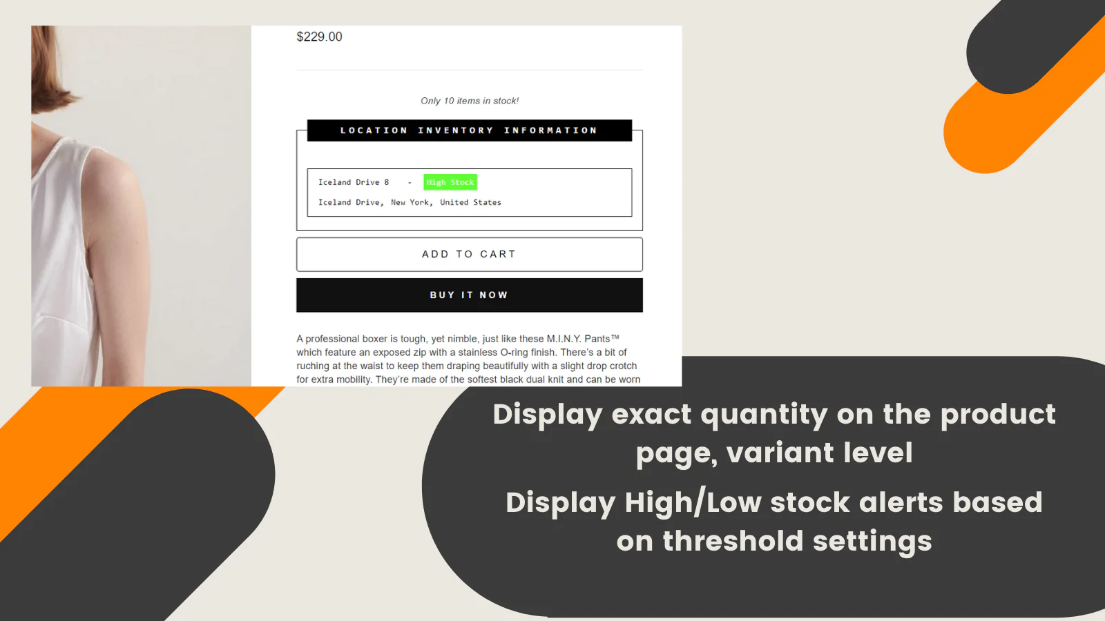 Inventory availability : Inventory availability at multiple locations, show quantity or low stock/ high stock alerts. Works at variant level!