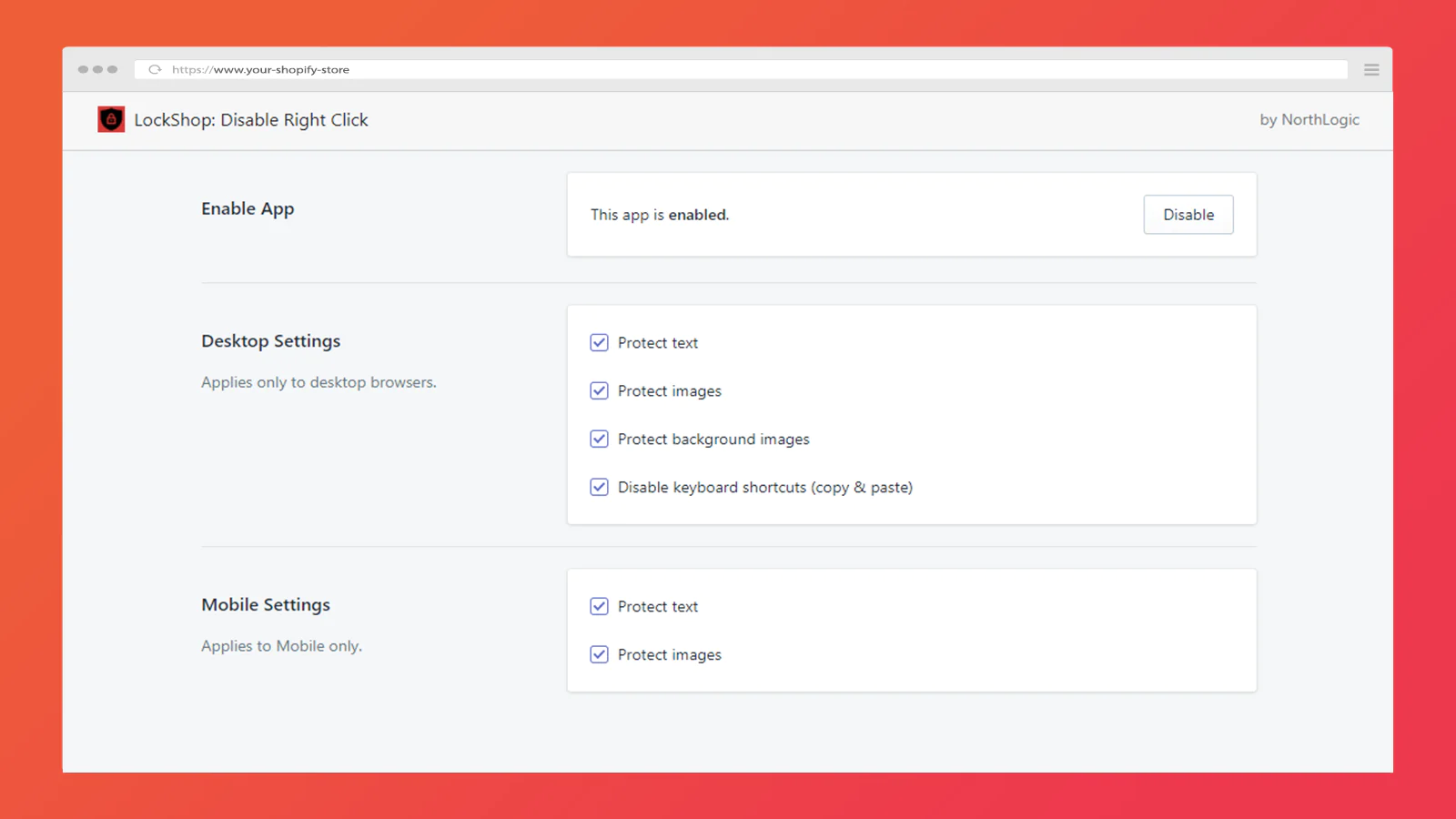 Prevent your text and images from being duplicated and used on a competitors store. The LockShop: Disable Right Click app solves this issue in seconds and adds an extra layer of protection to your store.