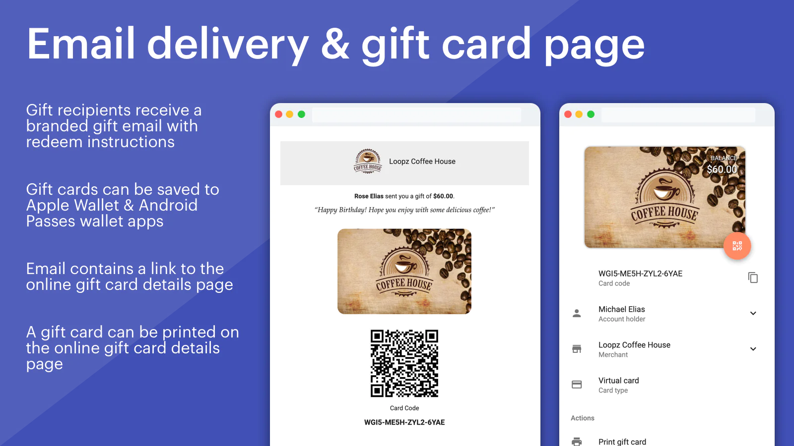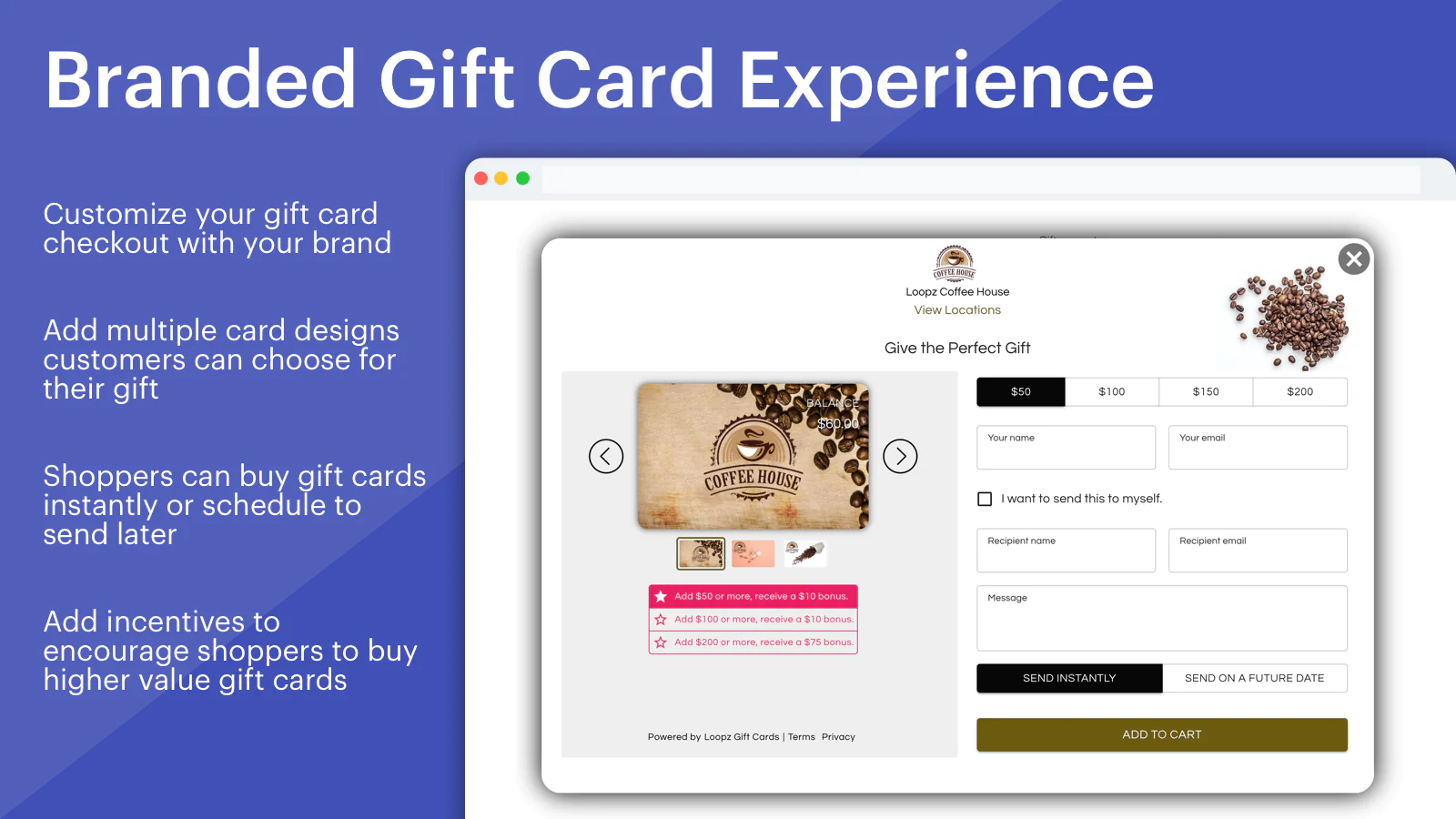 Customize our gift card experience with your branding and styles. Create multiple card designs for different occasions for customers to choose from. Customers can choose their gift amount, recipient details and enter a personal message. Gift cards can be delivered at a time of the purchaser's choosing or delivered instantly.