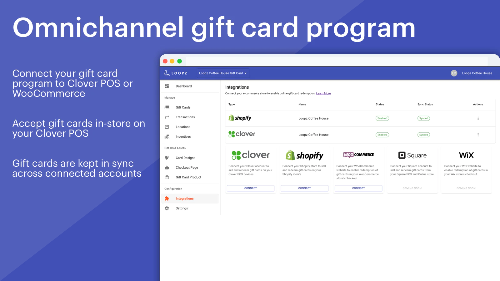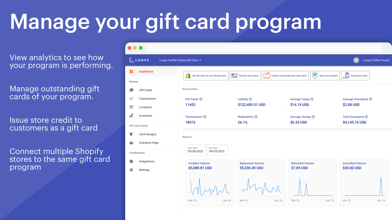 Manage your gift card program : View analytics to see how your gift card program is performing and manage gift cards on your online dashboard.
