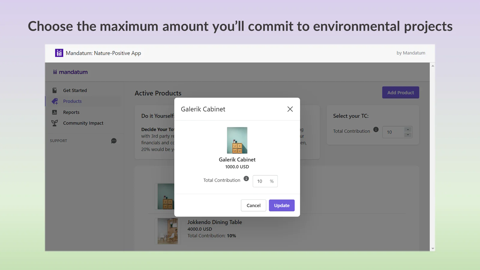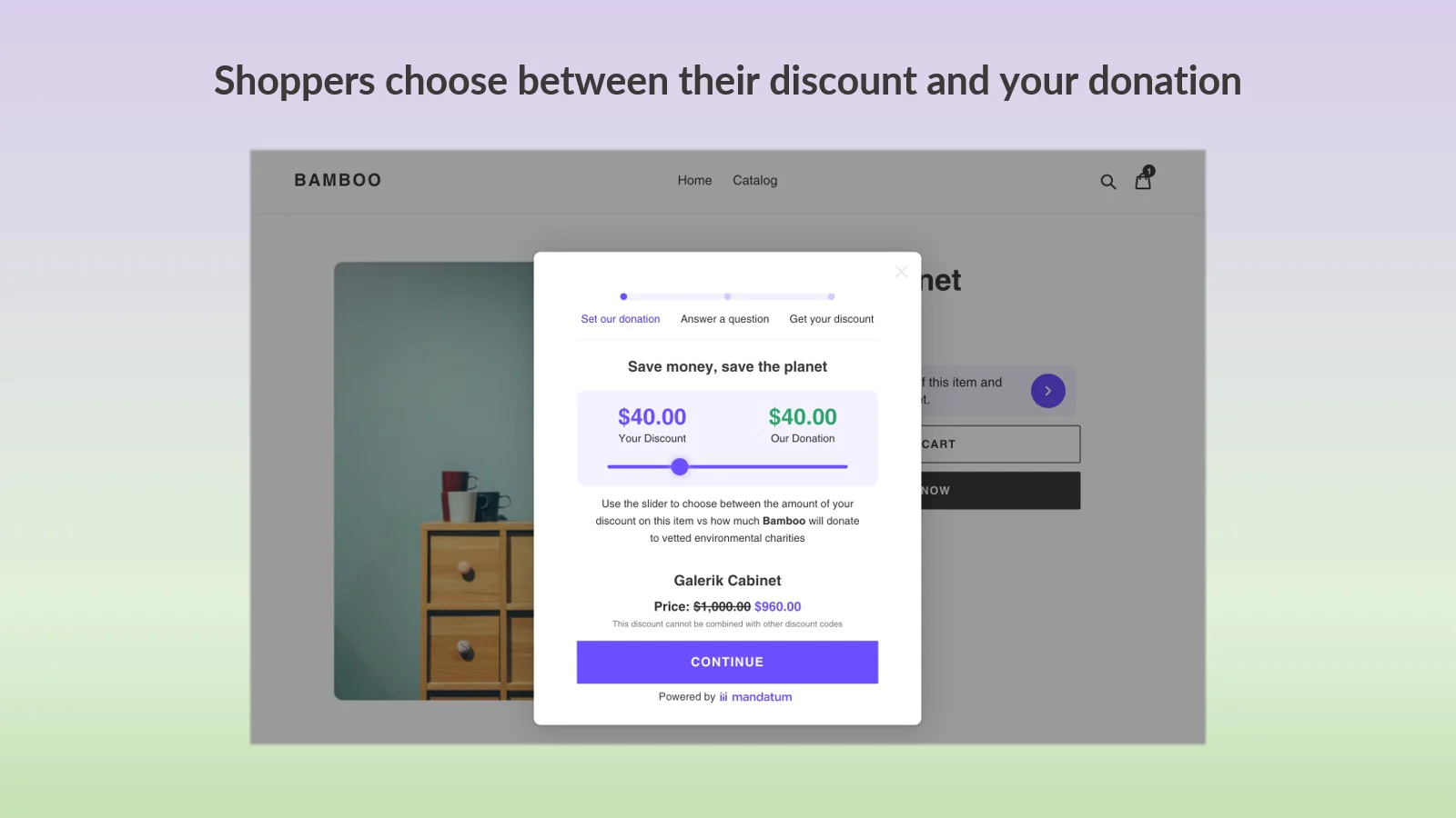 Shoppers use Mandatum to choose between a discount on the product or a donation you make to the environment. Items added to the cart using Mandatum integrate seamlessly with your existing checkout and your donations are automatically made to our vetted environmental partner projects.