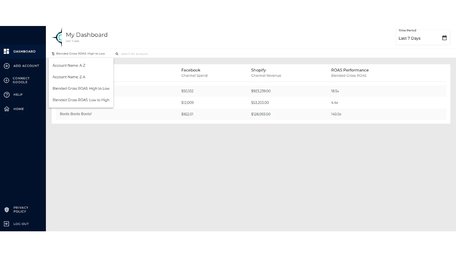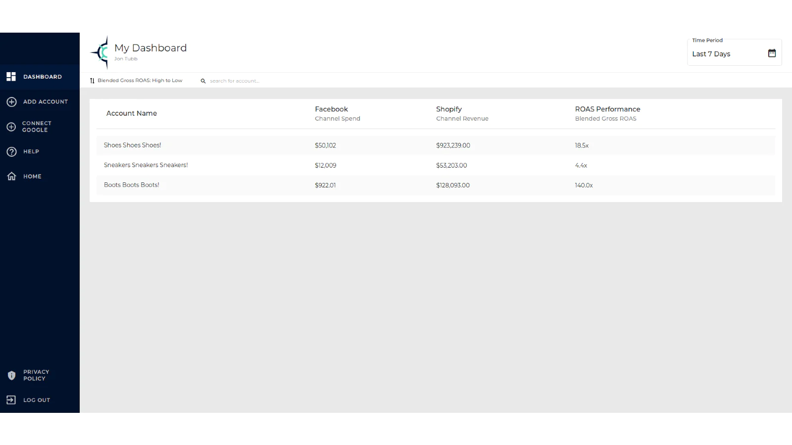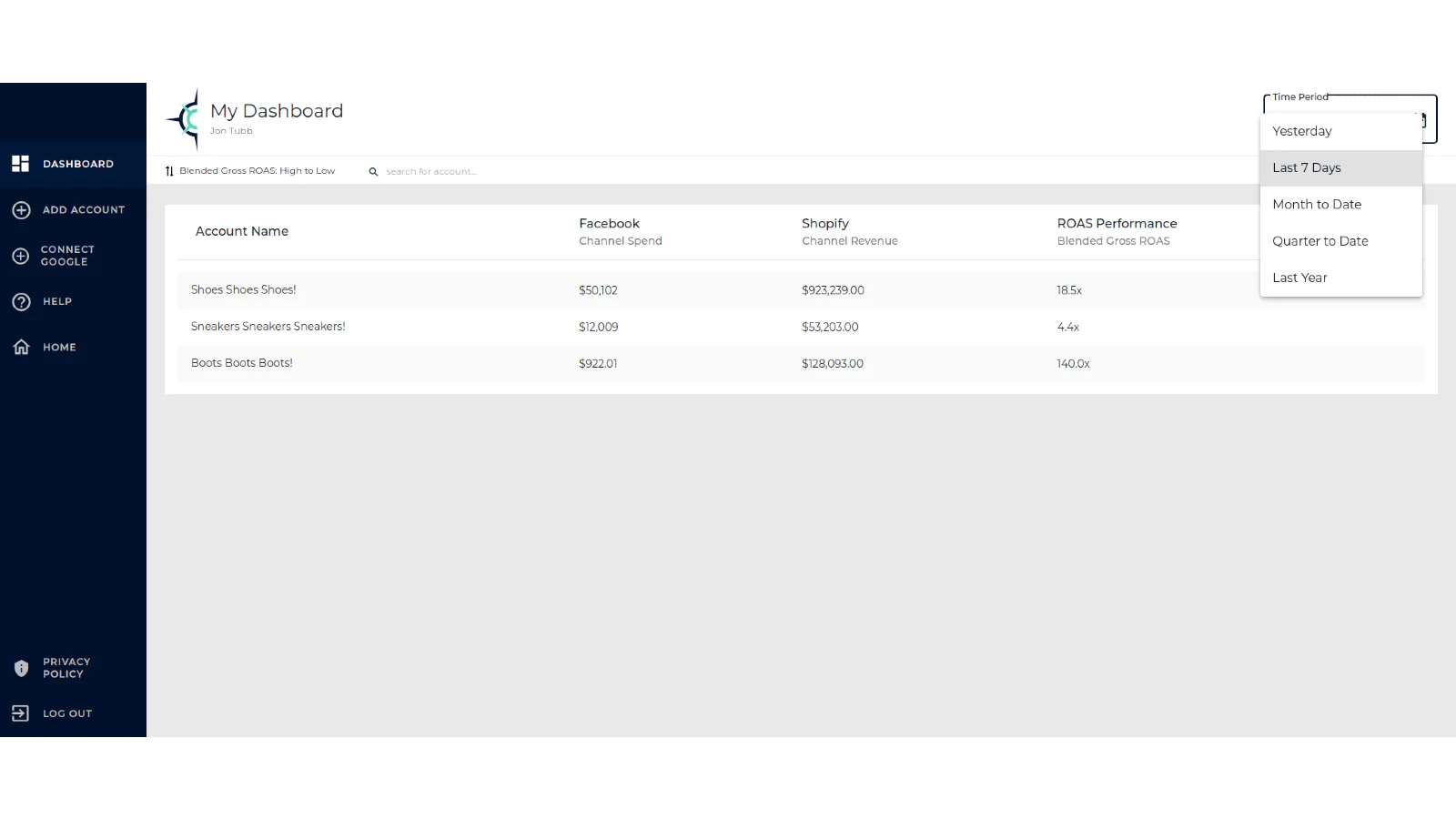 Gone are the days of having to jump back and forth between Facebook Ads Manager, Google Ads Manager, Snapchat Ads Manager, Shopify, etc. With a few simple clicks, you can now see all of that data in one clean dashboard.