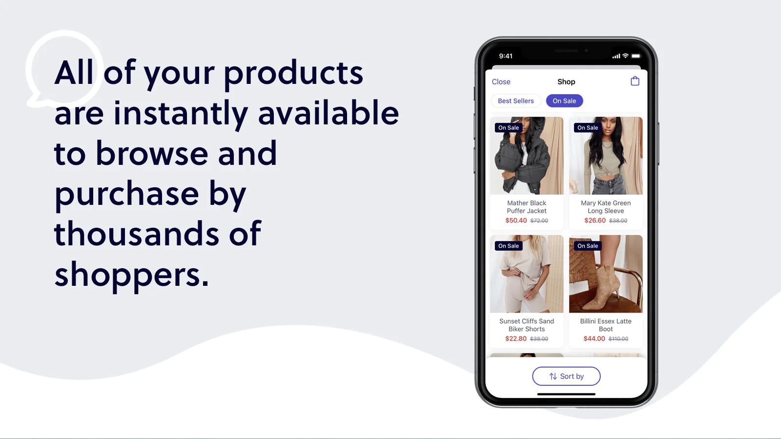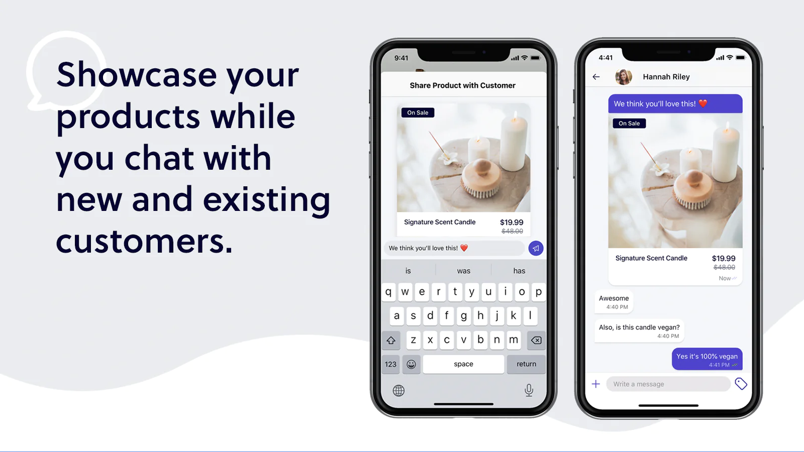 Install our app to easily include and sell your products when chatting with your customers in our app. Your products will be available to share & sell from your business account.