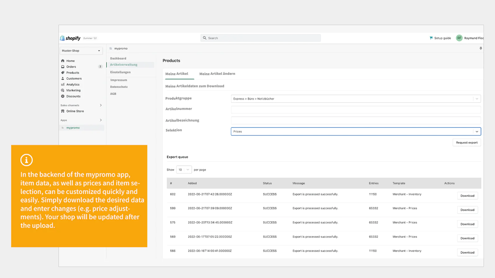 Dafür gibt es 2 Möglichkeiten: Sie sehen Ihre Aufträge direkt im Shopify-Backend. Hier gibt es weitere Informationen zu den Bestellungen im Shopify-Backend. Sie erhalten die Bestellungen außerdem per E-Mail mit einer WEX-Datei, um sie in Ihre Warenwirtschaft einzulesen (sofern Ihr Ganzen Artikel lesen Der Beitrag Wie erhalten Sie als Händler Ihre Auftragsdaten? erschien zuerst auf Mypromo Network GmbH.
