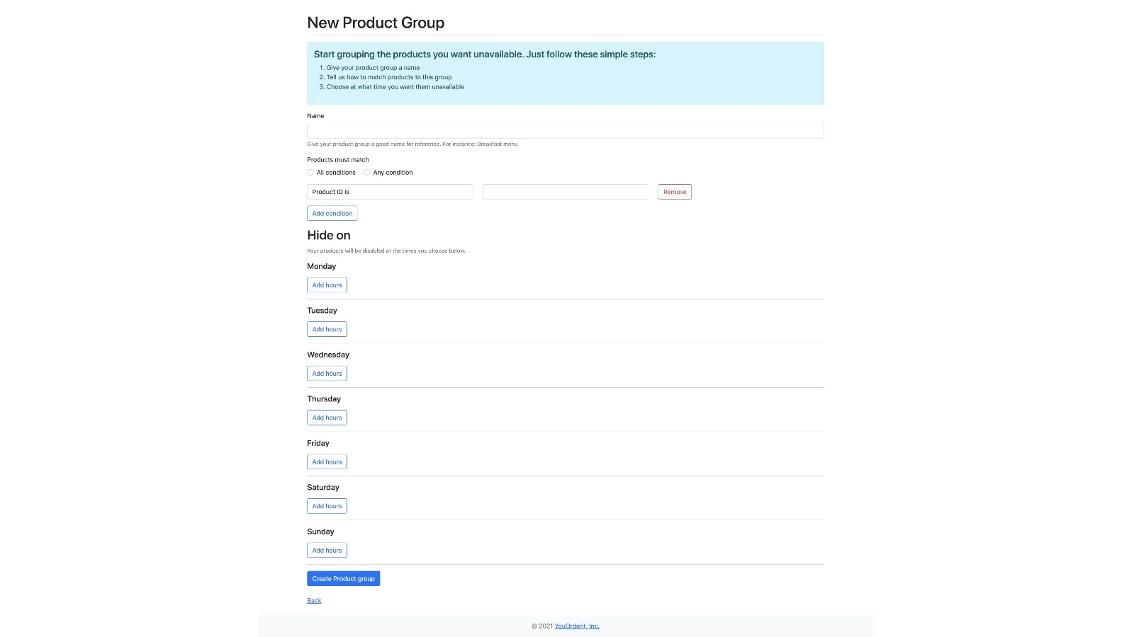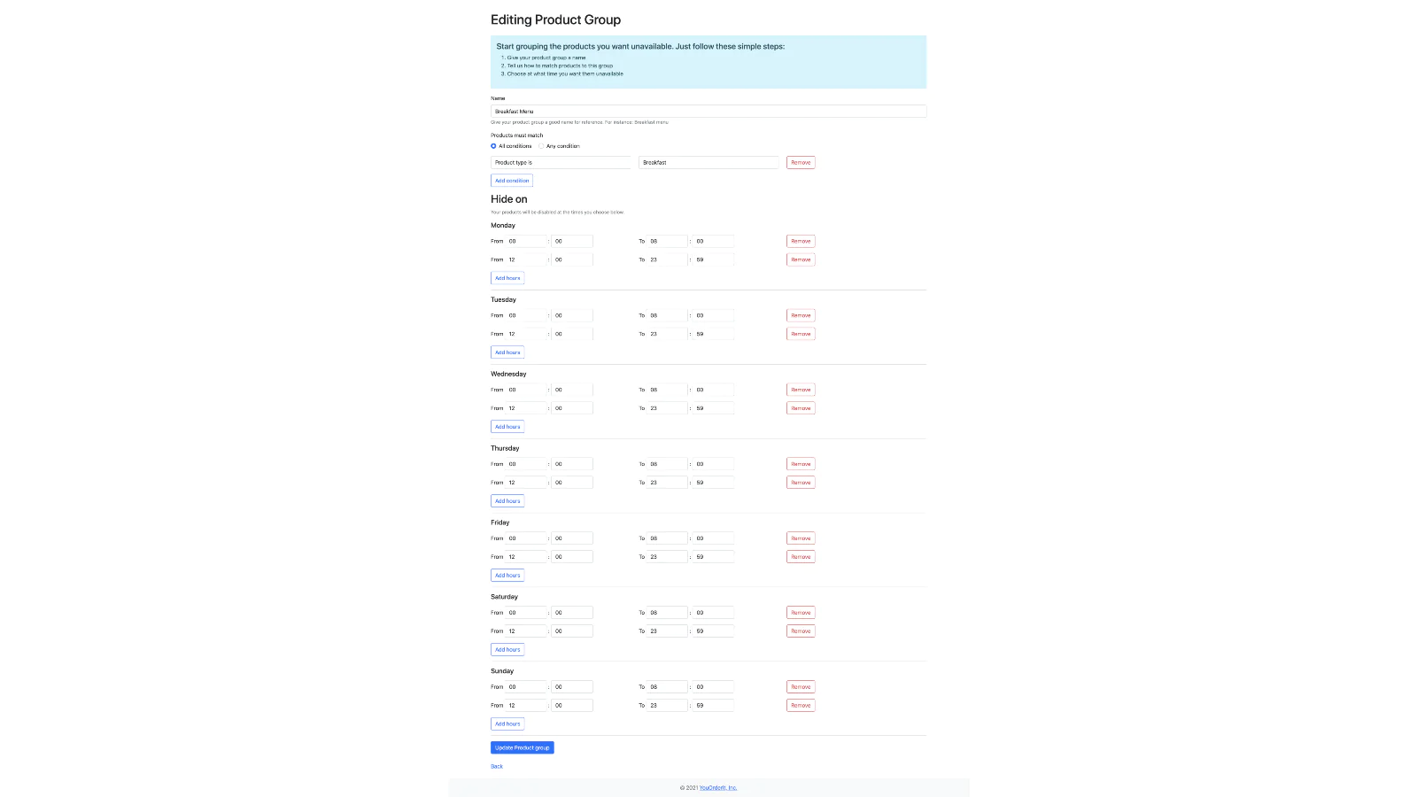 Set a time to disable products : Choose a time range in which your products are unavailable