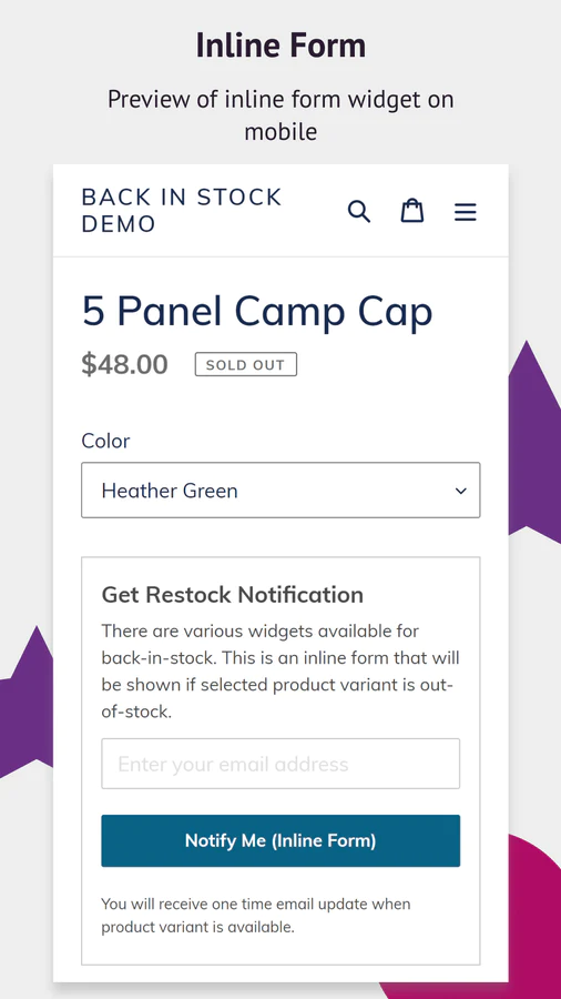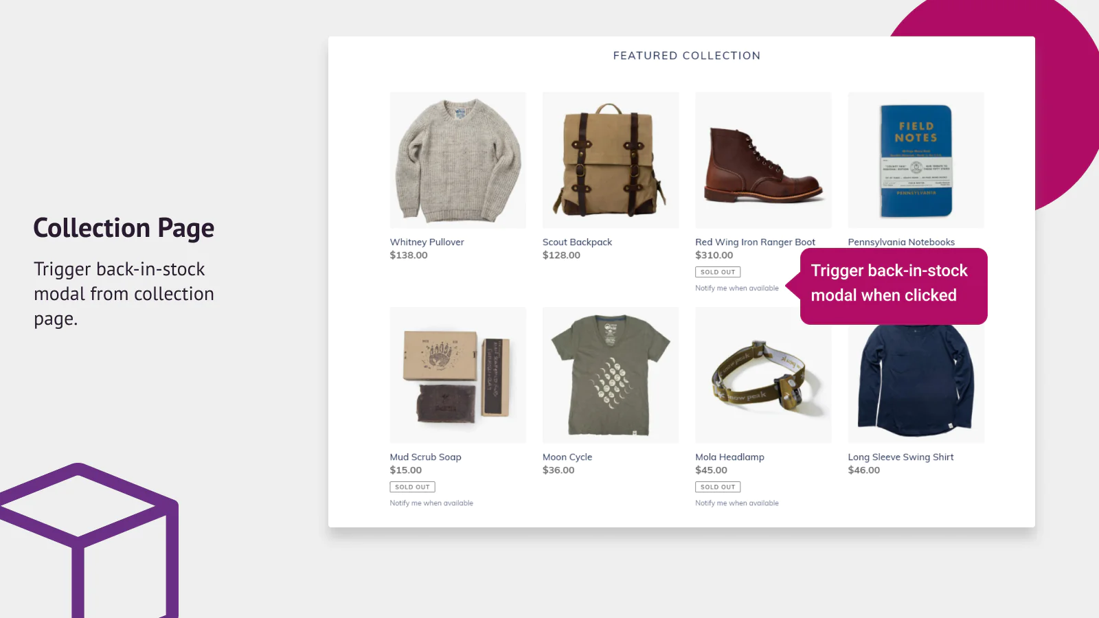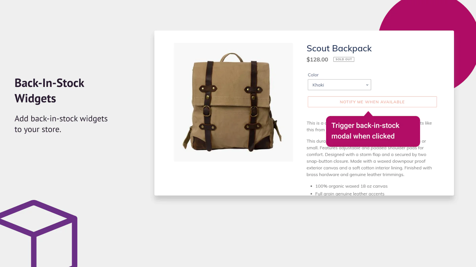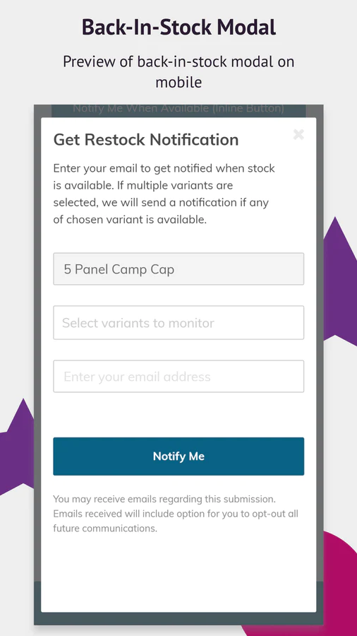 A merchant loses revenue every time customers view an out-of-stock item. These revenue can be recovered if you have a way to notify customers when out-of-stock items are replenished. OnVoard's Back-In-Stock tool makes it easy for merchants to allow customers to subscribe for back in stock notifications and automatically notifies them when products are restocked.