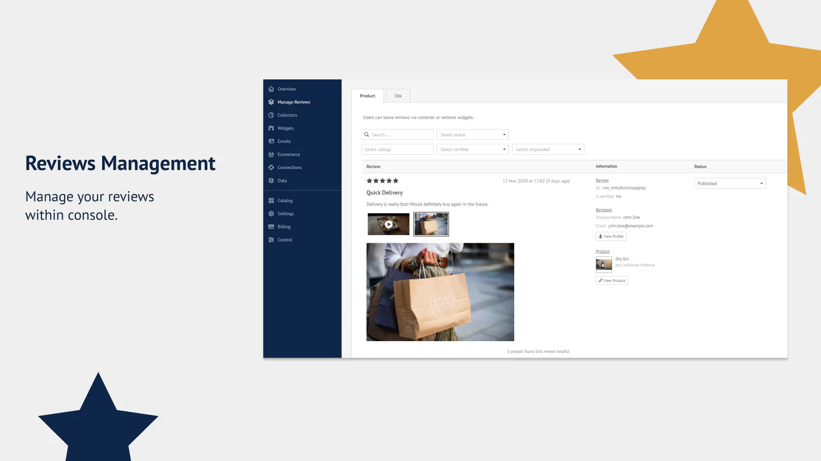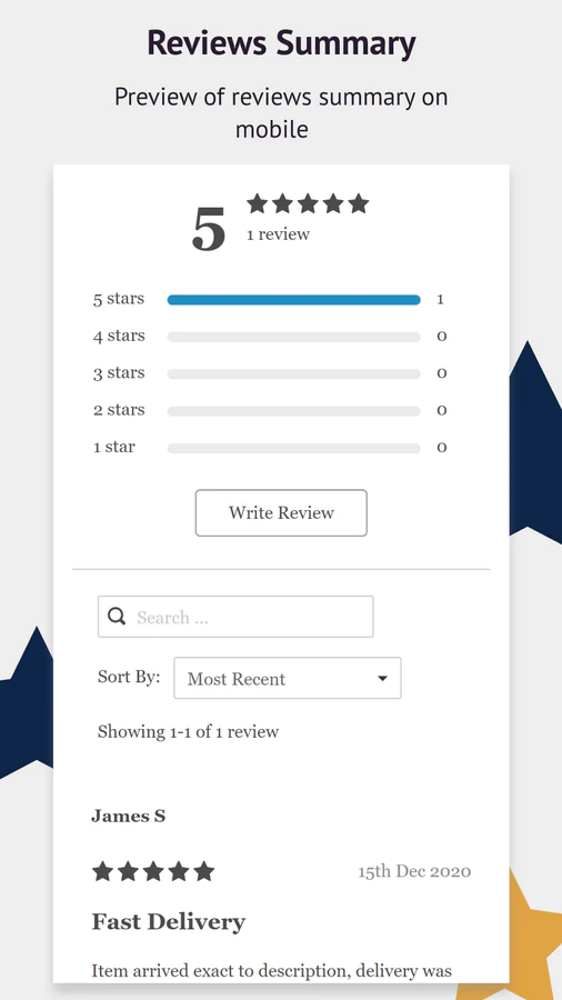 Inspired by how top ecommerce sites showcase their reviews, our reviews widget provides a clean and intuitive user interface to help you sell more with product reviews.