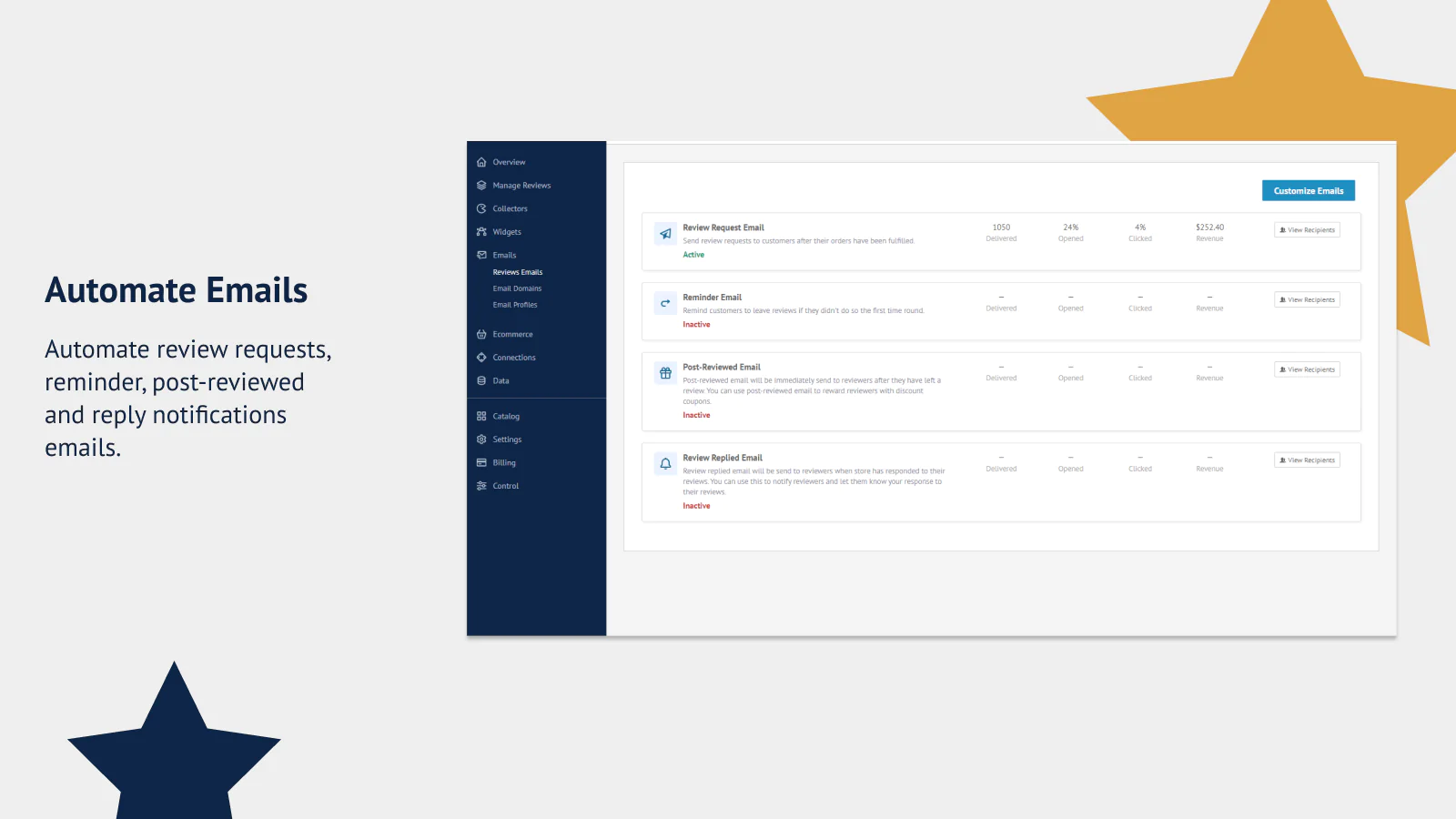 Automate Reviews Collection : Setup once and let OnVoard help you request, remind, reward and notify your customers for reviews emails