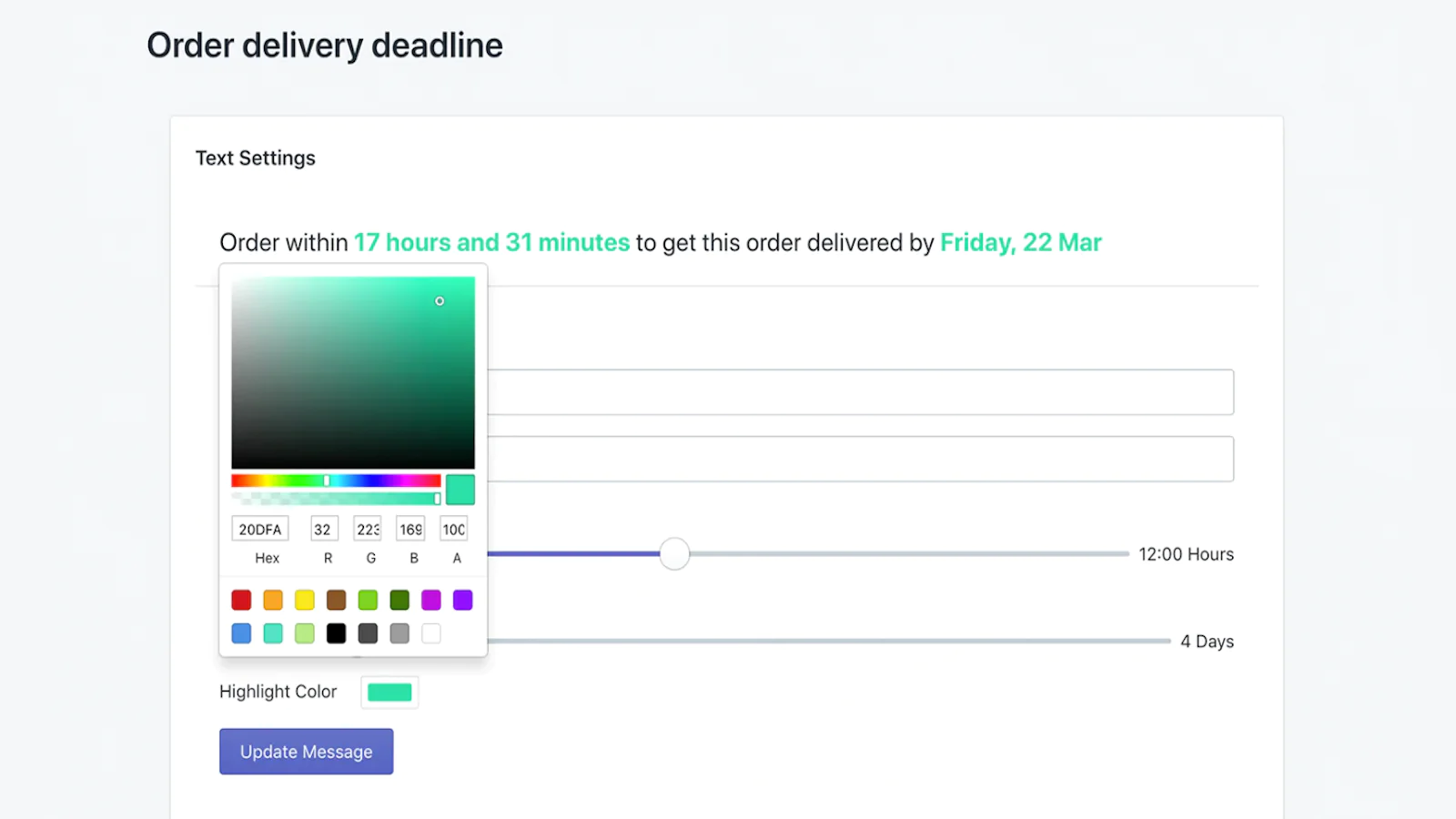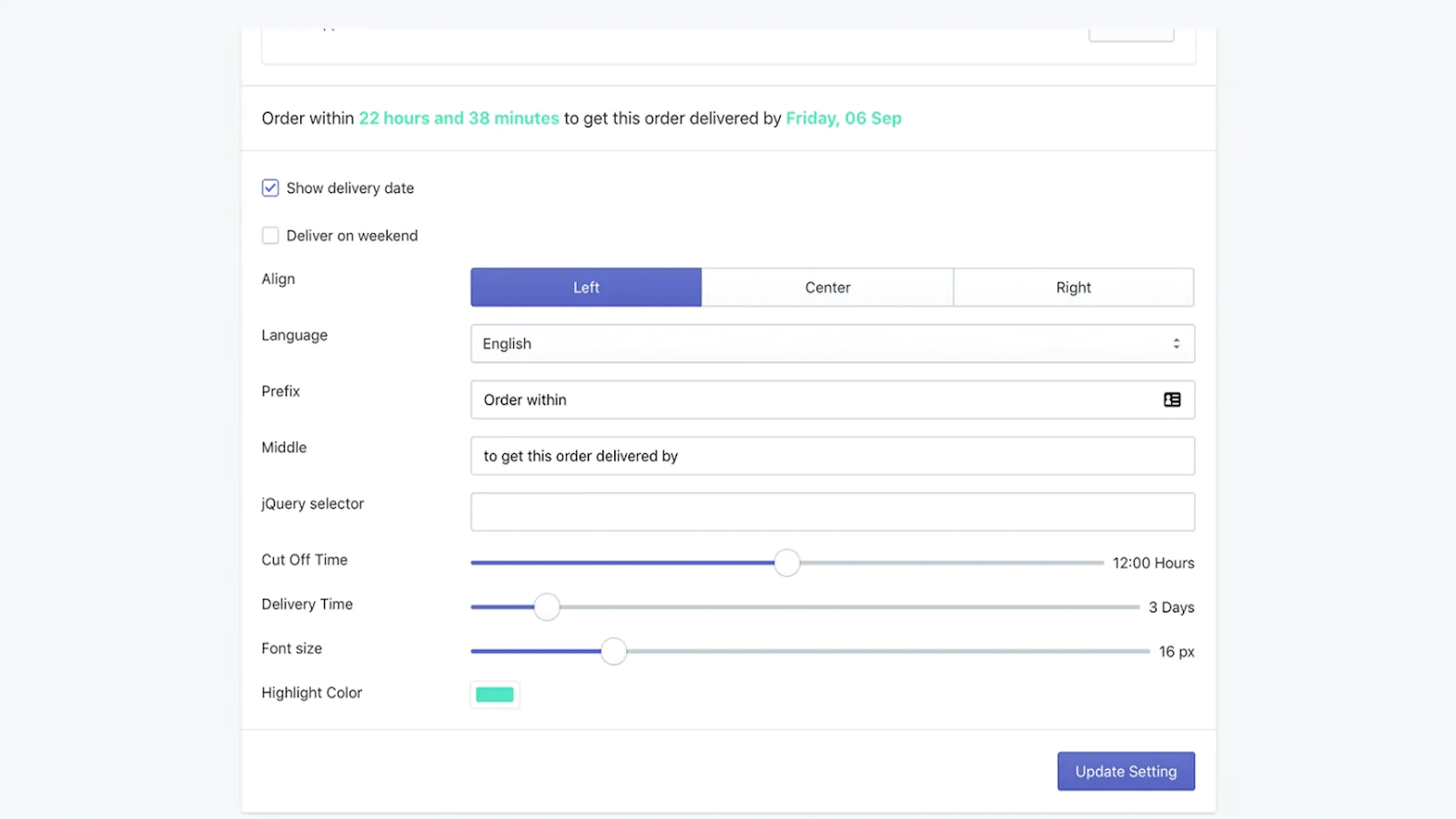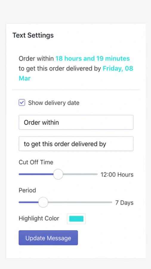 We have listened to all of our customers feedback and just released a new update with the following features : You can now make multiple cut-off's for different products You can now align the text left/right/center. You can now change the font size. You can now allow delivery on Saturday and Sundays. You can now use a custom jQuery selector You can now define different delivery times for each product. You can now choose a language.