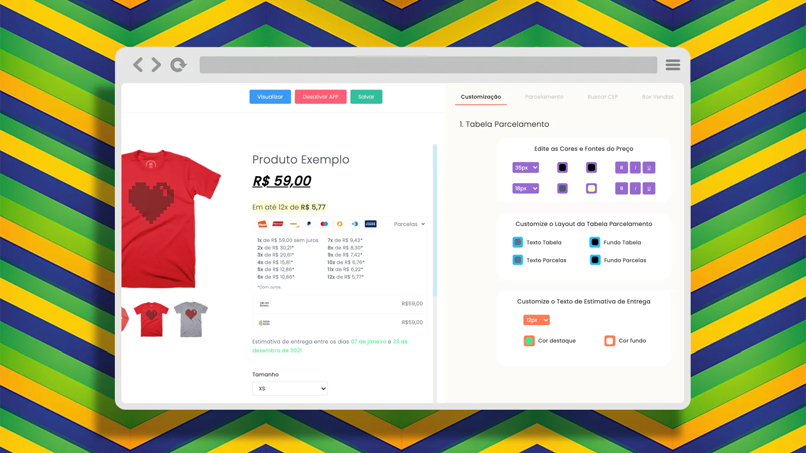 O aplicativo mostra o parcelamento na galeria e na página do produto. Você vai conseguir editar as cores e fontes do preço, customizar o layout, o fundo e o texto da tabela de parcelamento. Além disso, é possível customizar o texto da estimativa de entrega. A quantidade de parcelas que você deseja mostrar na loja também é editável.