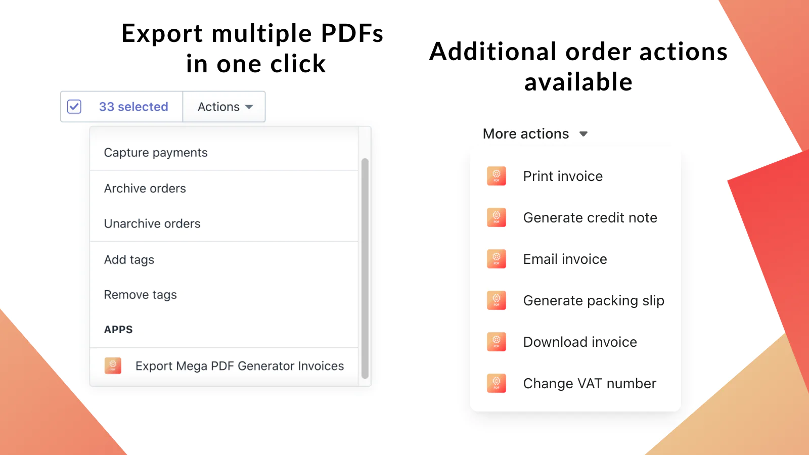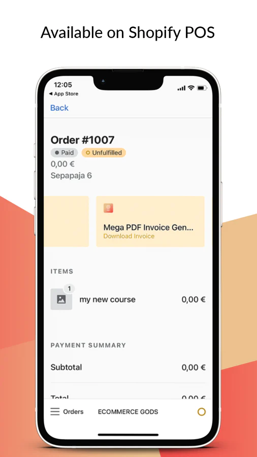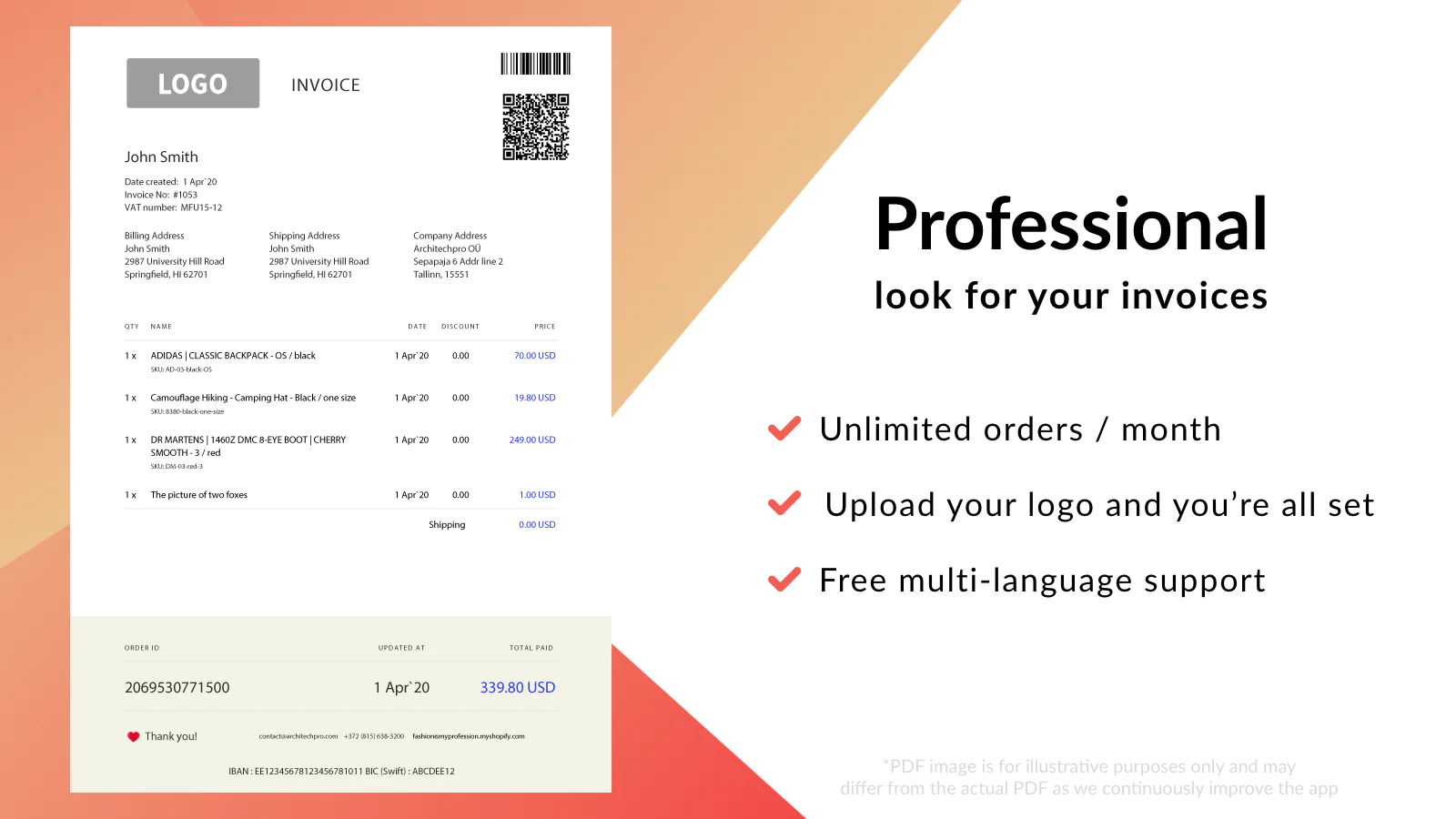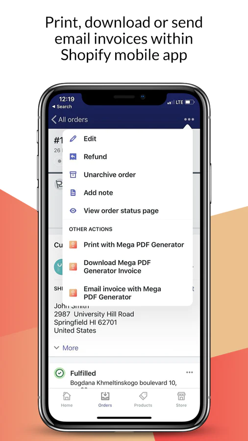 Mega PDF Invoice Generator integrates with your Shopify store and listens to new orders. You define if you need the app to track when the order is created, paid or fulfilled. Once order event has been triggered, app automatically sends an email with the PDF invoice attached