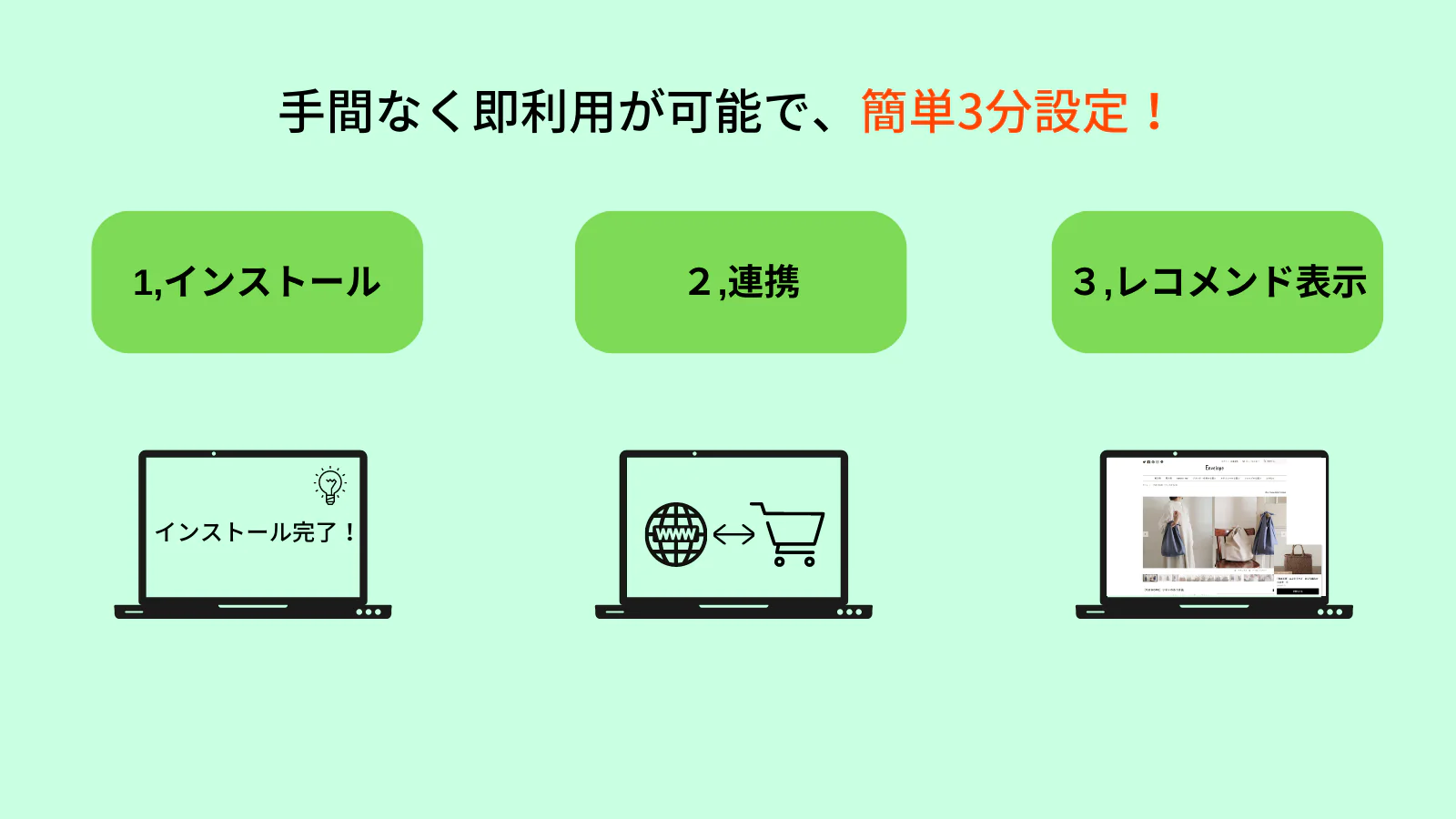 LTV向上(アップセル/クロスセルによる売上増加) : 機械学習の技術を用いて、TOP・詳細・カートページに、訪問したユーザーのニーズに沿った商品提案を行います。 導入の手間なく、アップセル、クロスセルに繋がるレコメンド(顧客提案)アプリです。