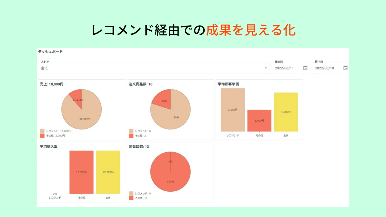 レコメンドの成果を見える化 : 全体の売上に対する、レコメンドの売上割合やインパクトを見える化し、「レコメンドの成果が見えない」状態を回避します。