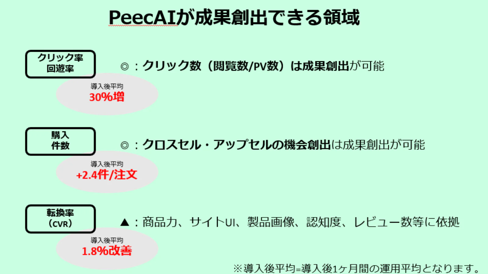 PeecAIは、クロスセル/アップセルを実現するパーソナライズされたEC体験を、自社EC(Shopify構築EC)で利用可能にするレコメンドアプリです。