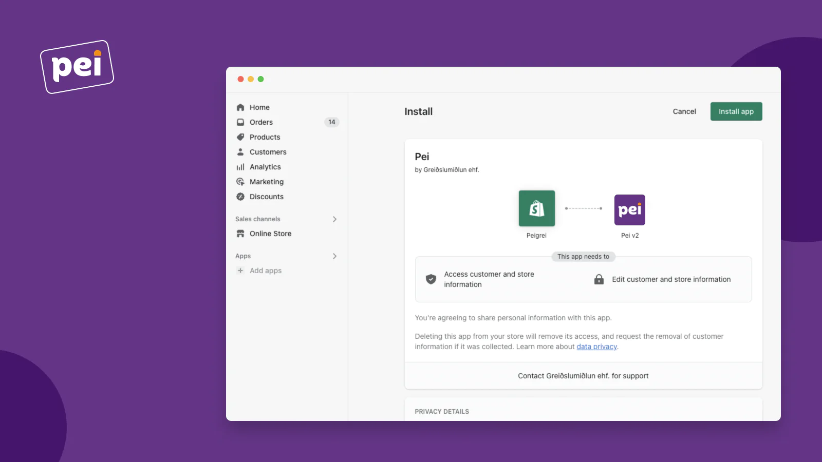 Þegar verslað er með Pei færð þú greiðsluseðil í heimabankann sem þú hefur 14 daga til að borga. Þú getur sótt um aukinn greiðslufrest með 30/60 þjónustunni eða dreift greiðslum á allt að 48 mánuði.