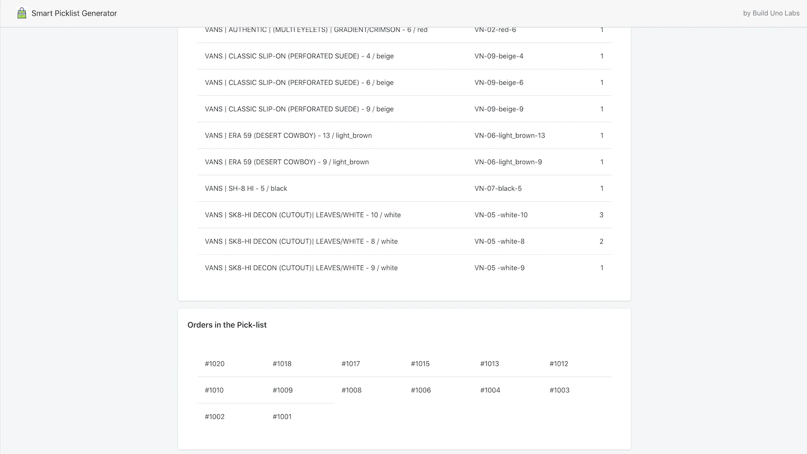 Generate a Picklist in 2 clicks for any set of orders in your Shopify store. Perfect for high inventory ranges, multiple size options or seasonal products.
