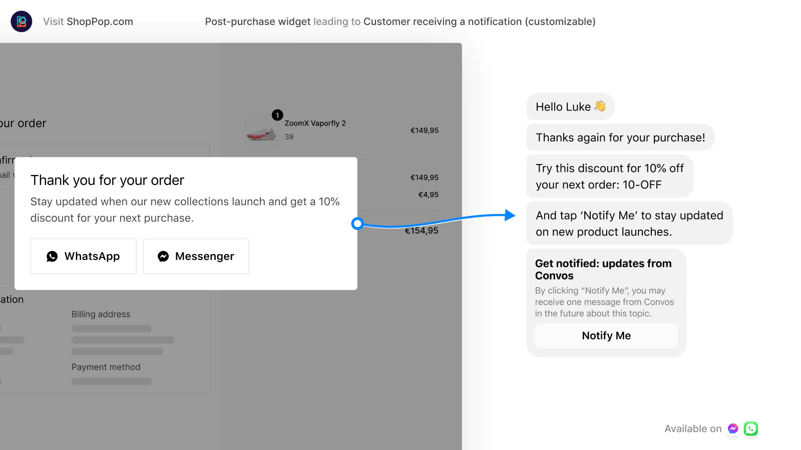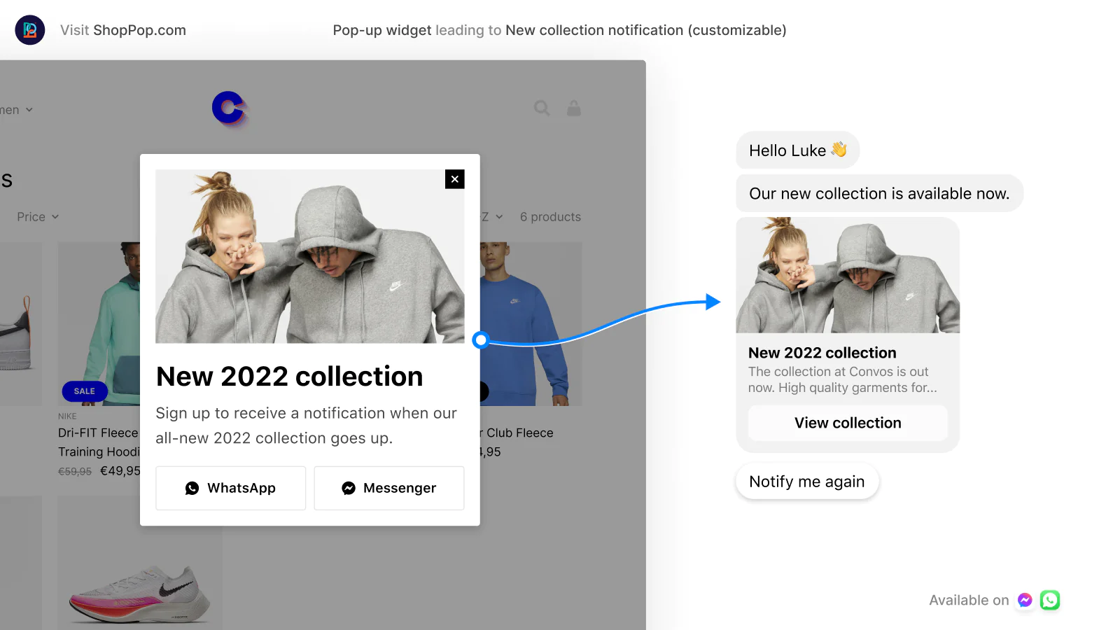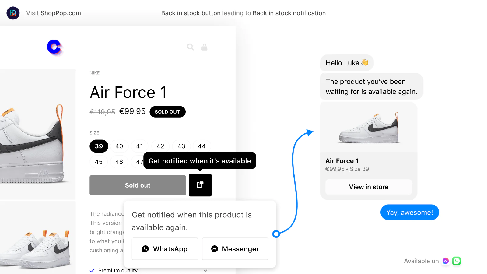 ShopPop makes it possible to build one-on-one customer relationships using timely and relevant notifications to WhatsApp and Messenger. We’ll help you drive customers back to your store and increase sales with automatic product notifications like back in stock, new collection drop as well as more general promotional notifications.