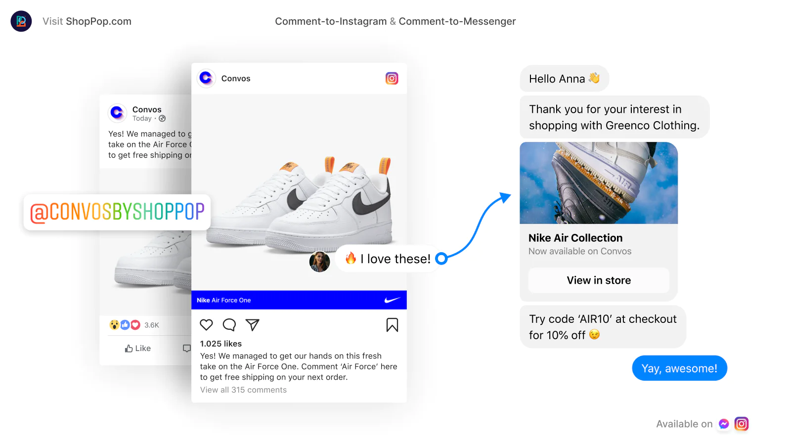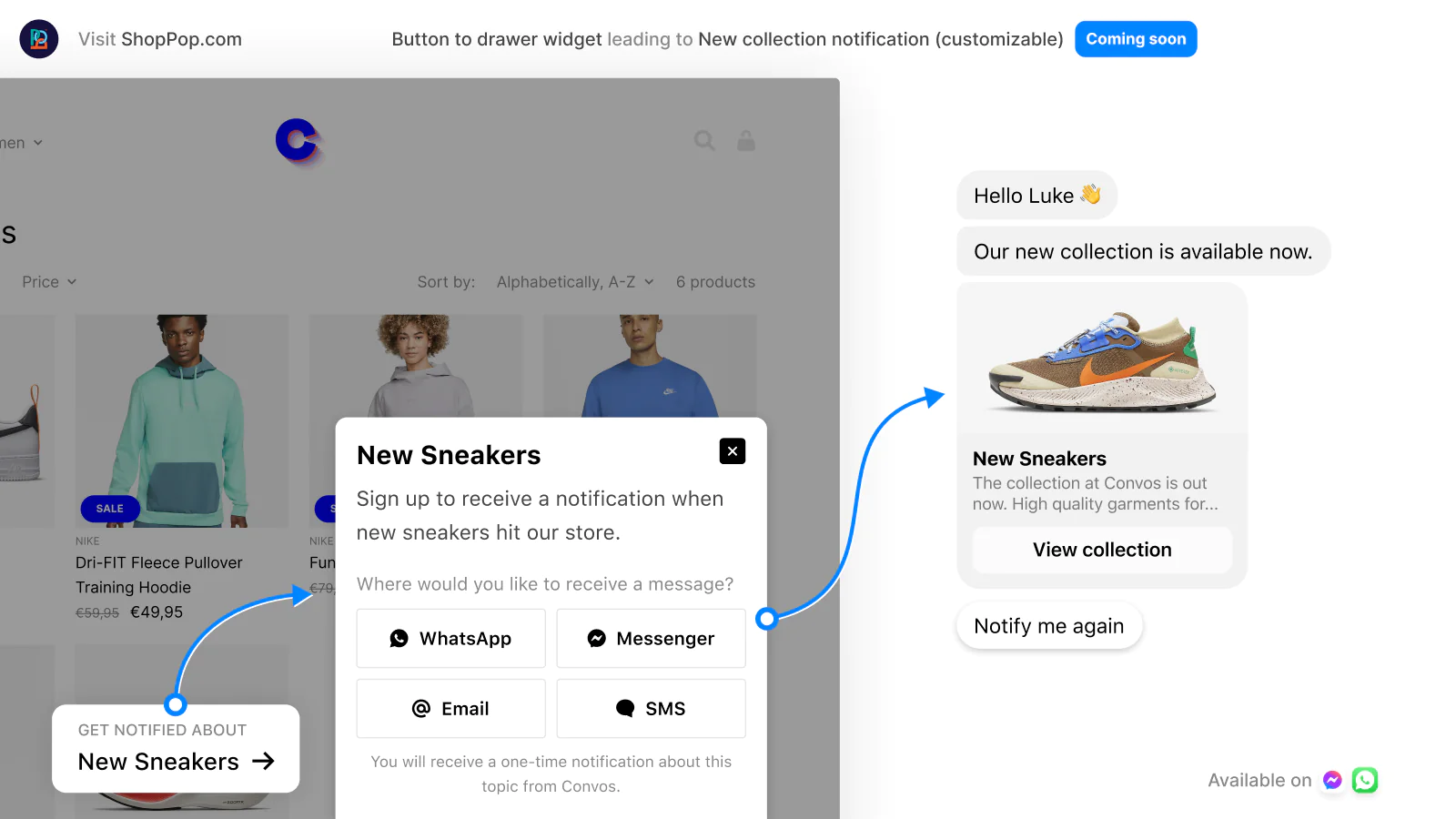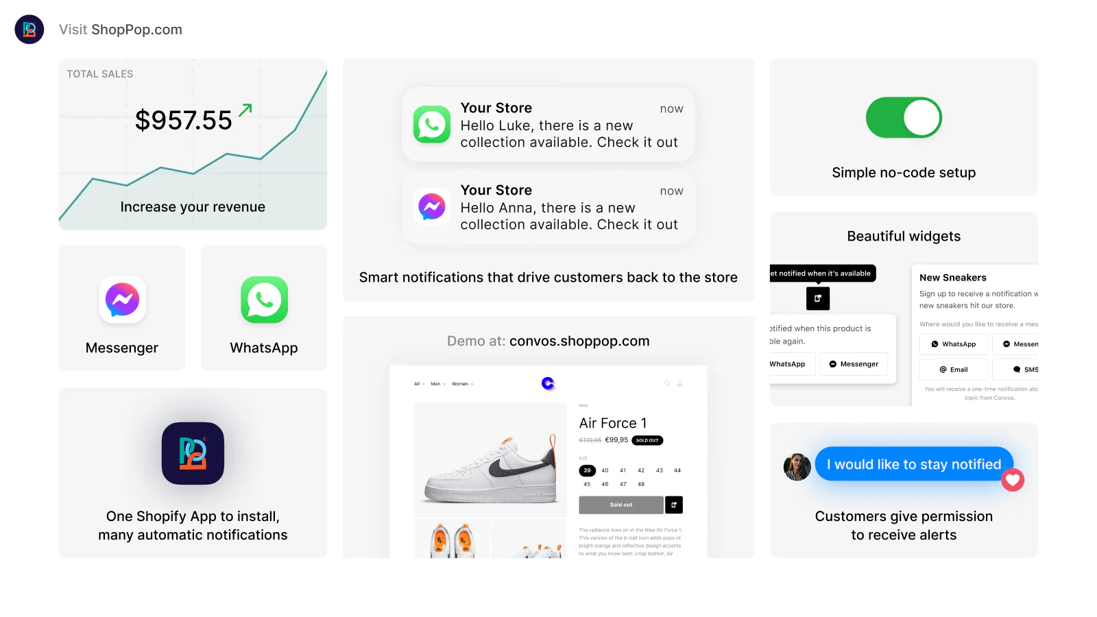 ShopPop makes it possible to build one-on-one customer relationships using timely and relevant notifications to WhatsApp and Messenger. We’ll help you drive customers back to your store and increase sales with automatic product notifications like back in stock, new collection drop as well as more general promotional notifications.