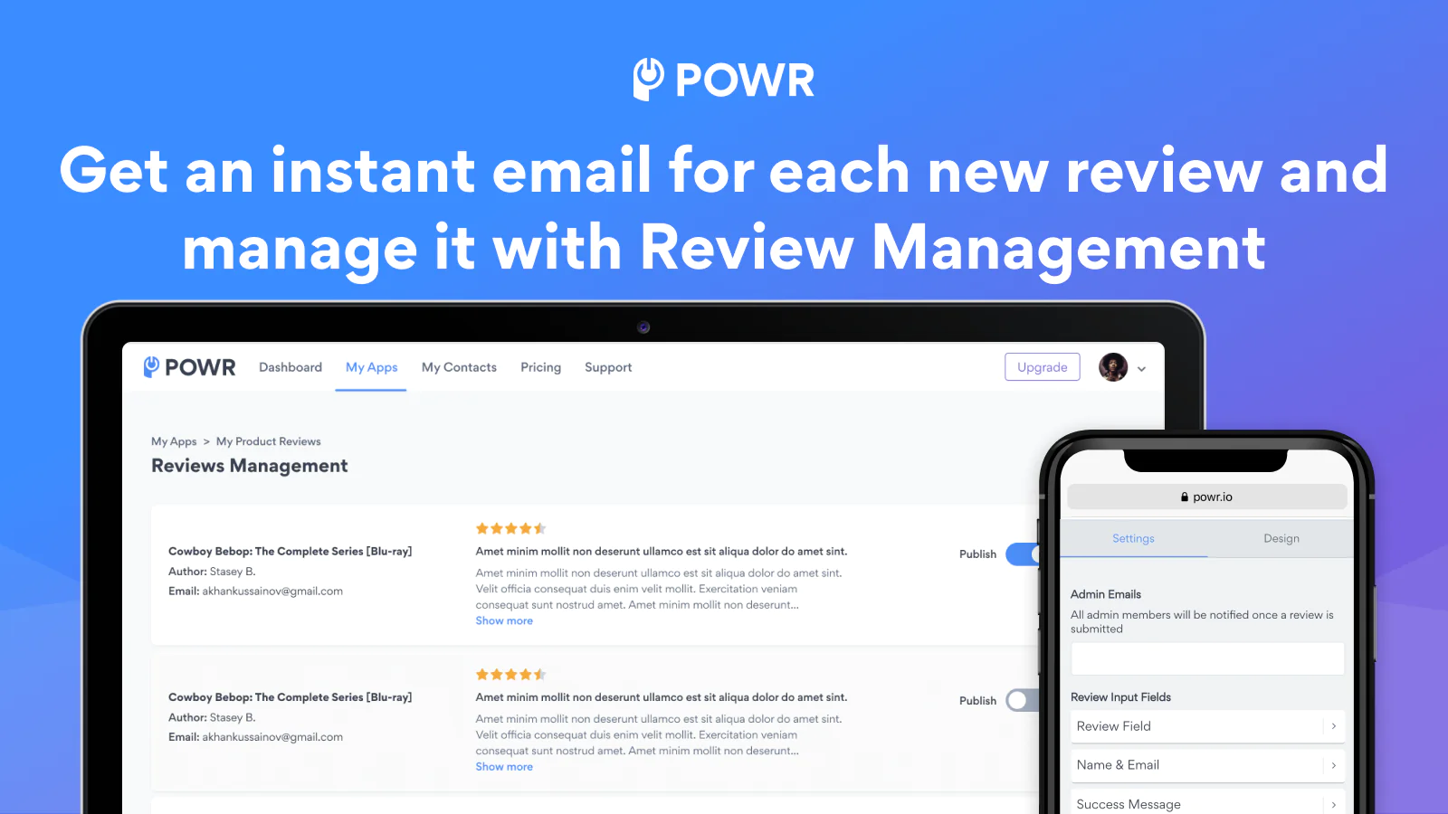 Show Product Ratings & Reviews : Display product reviews on all product pages. Sync reviewer contact information with Shopify Customers. Manage reviews in one easy interface