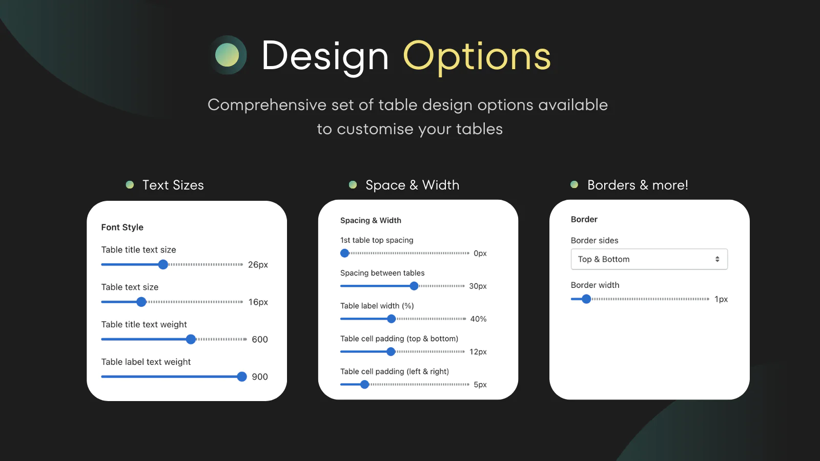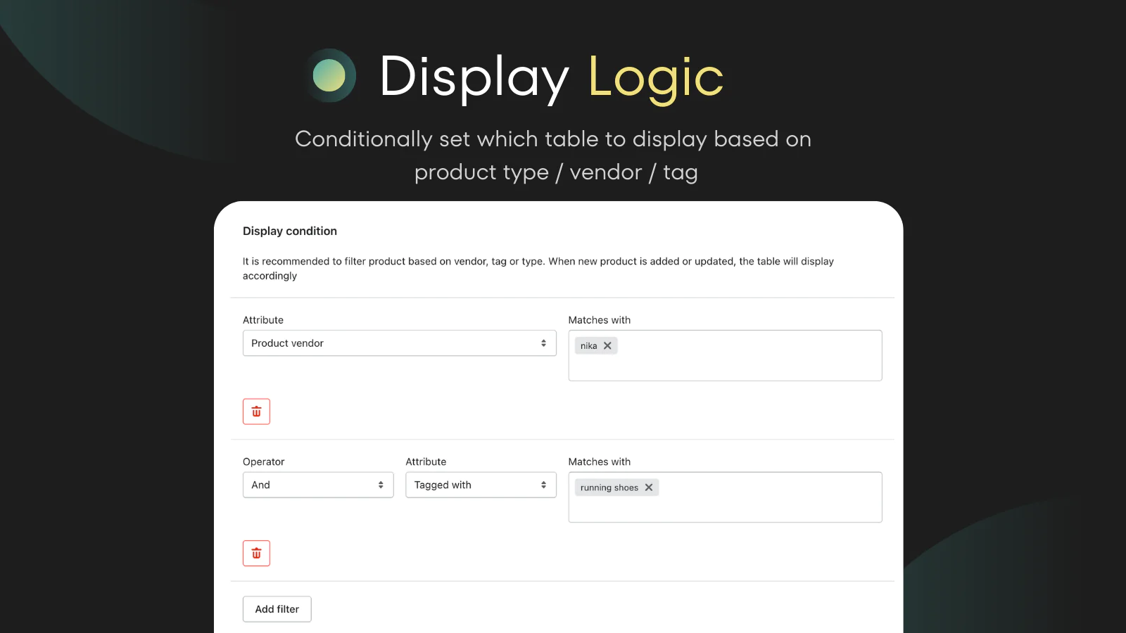 Display conditions : Publish tables to all your product page filtered by product tag, vendor or type