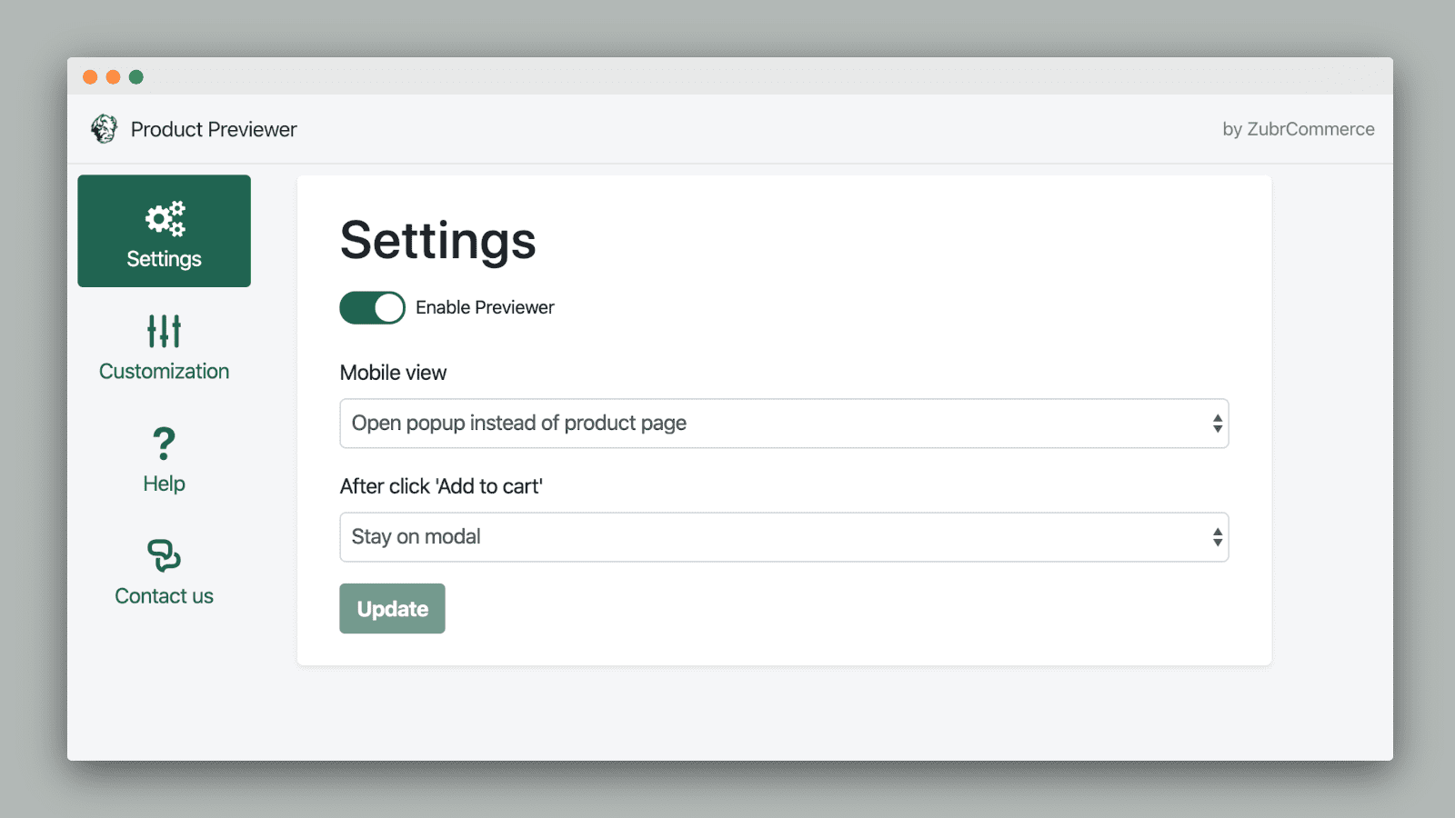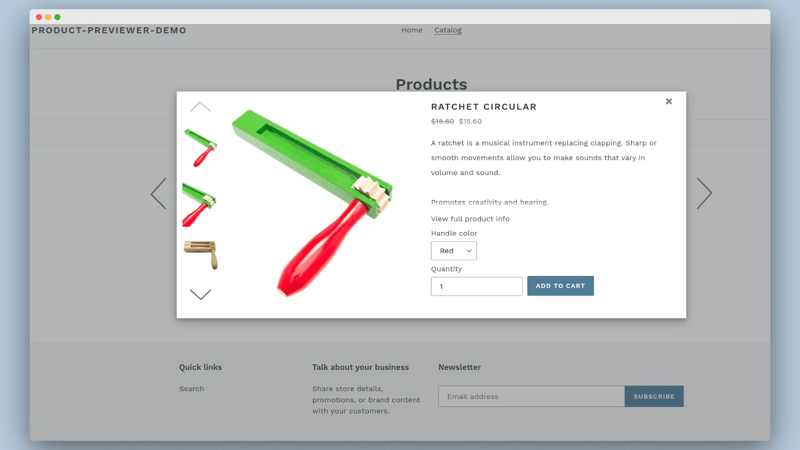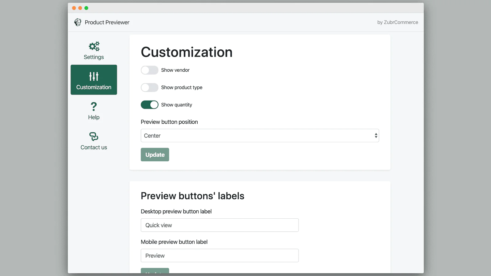 Themes integration. Simply install Product Previewer and enjoy its automatic adaptation to your Shopify theme. Change your store design, and Product Previewer will adjust.