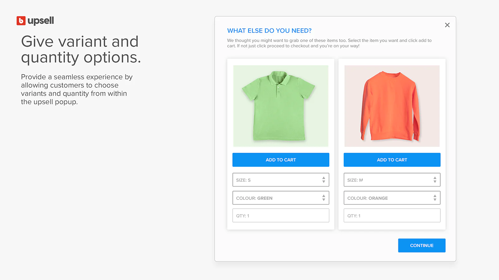 Allow customers to choose variants and quantities from within the upsell offer window.