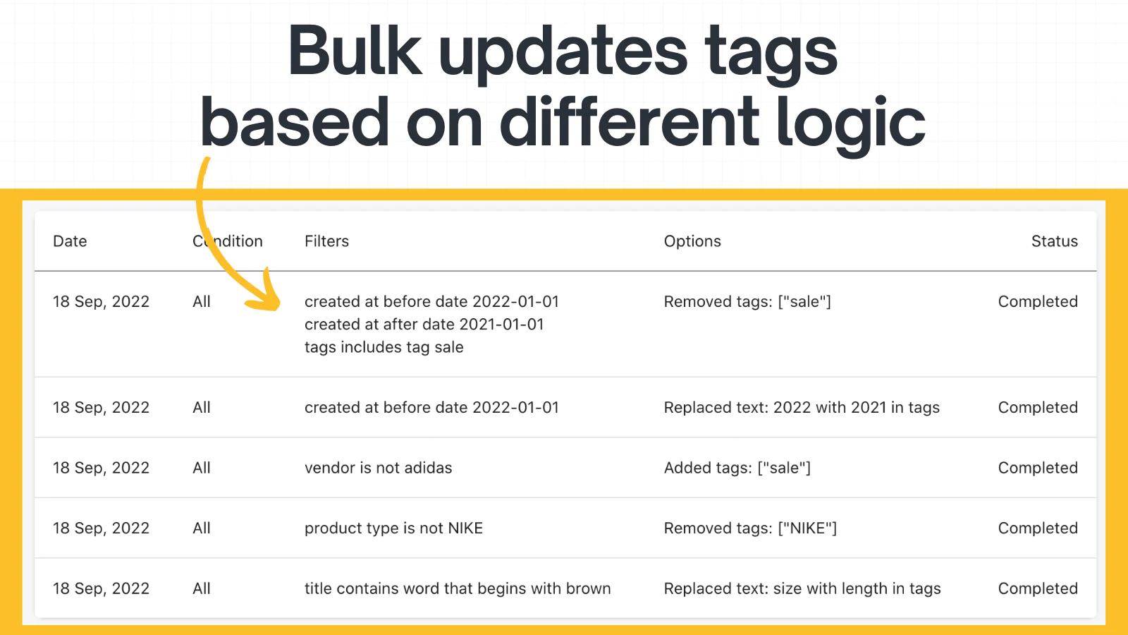 Advanced filter : Selectively choose specific products using filters, and/or apply tags to thousands of products