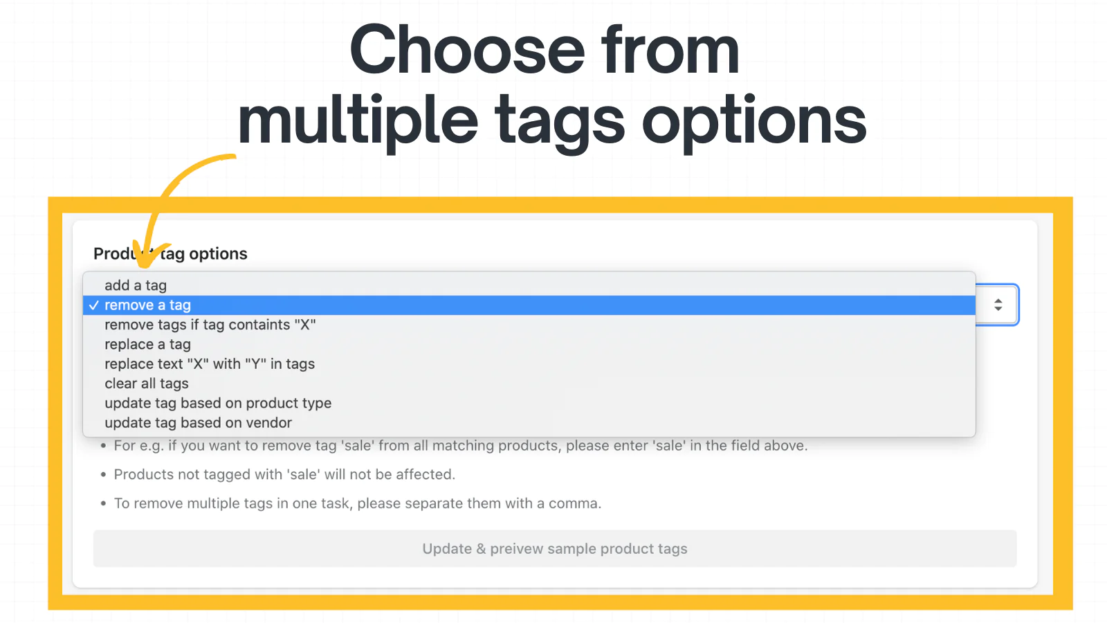 Custom product tags : Choose the product tags format, hit optimize and the app will bulk update all the product tags in one go!