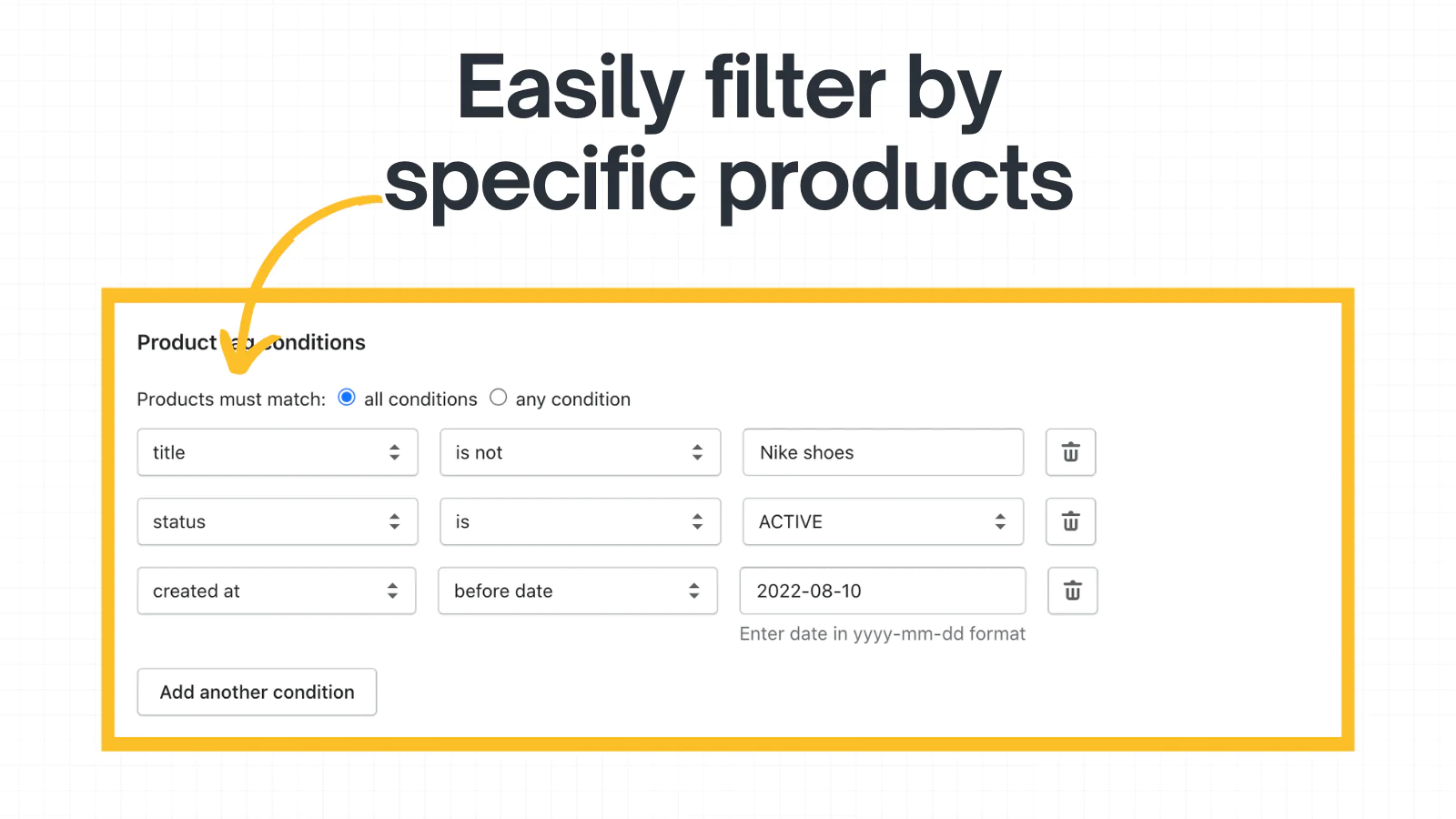 Our product filters allows you to selectively choose products. Then, you can modify product tags or product image alt text in many different ways.