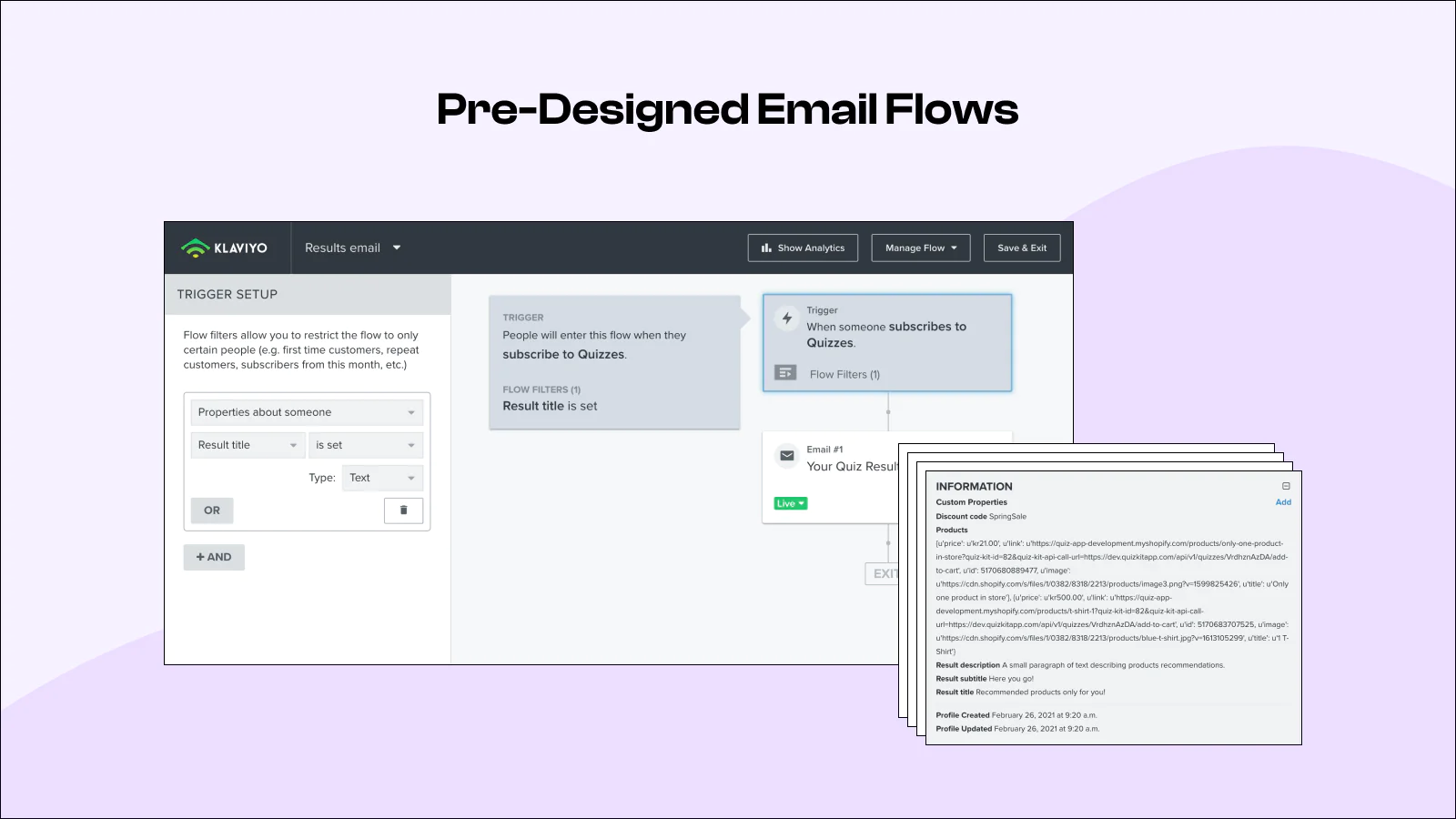 We've built a fully personalized version of Quiz Kit that allows you to show quiz results and recommended products right on the site. No more relying directly on email!