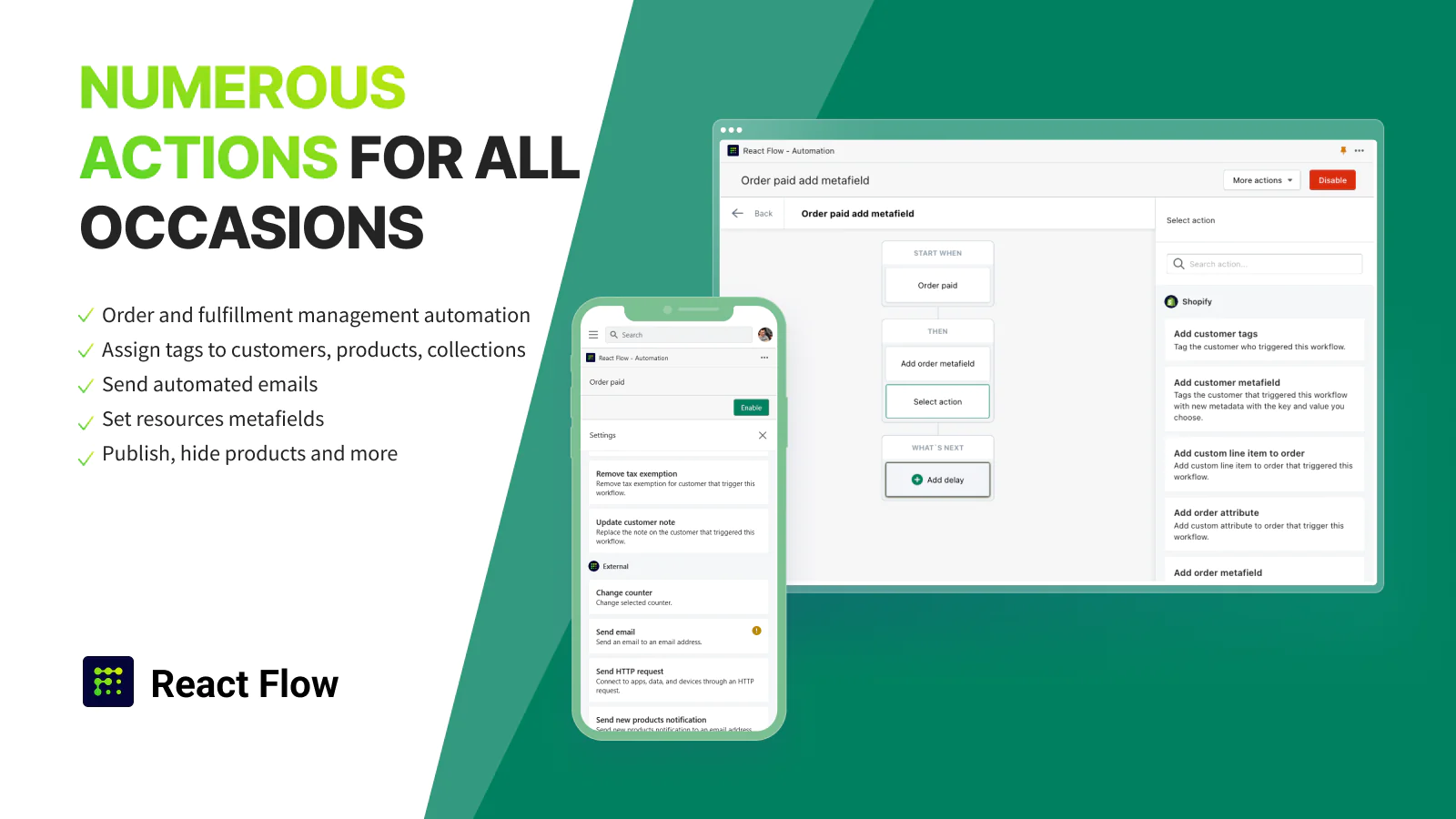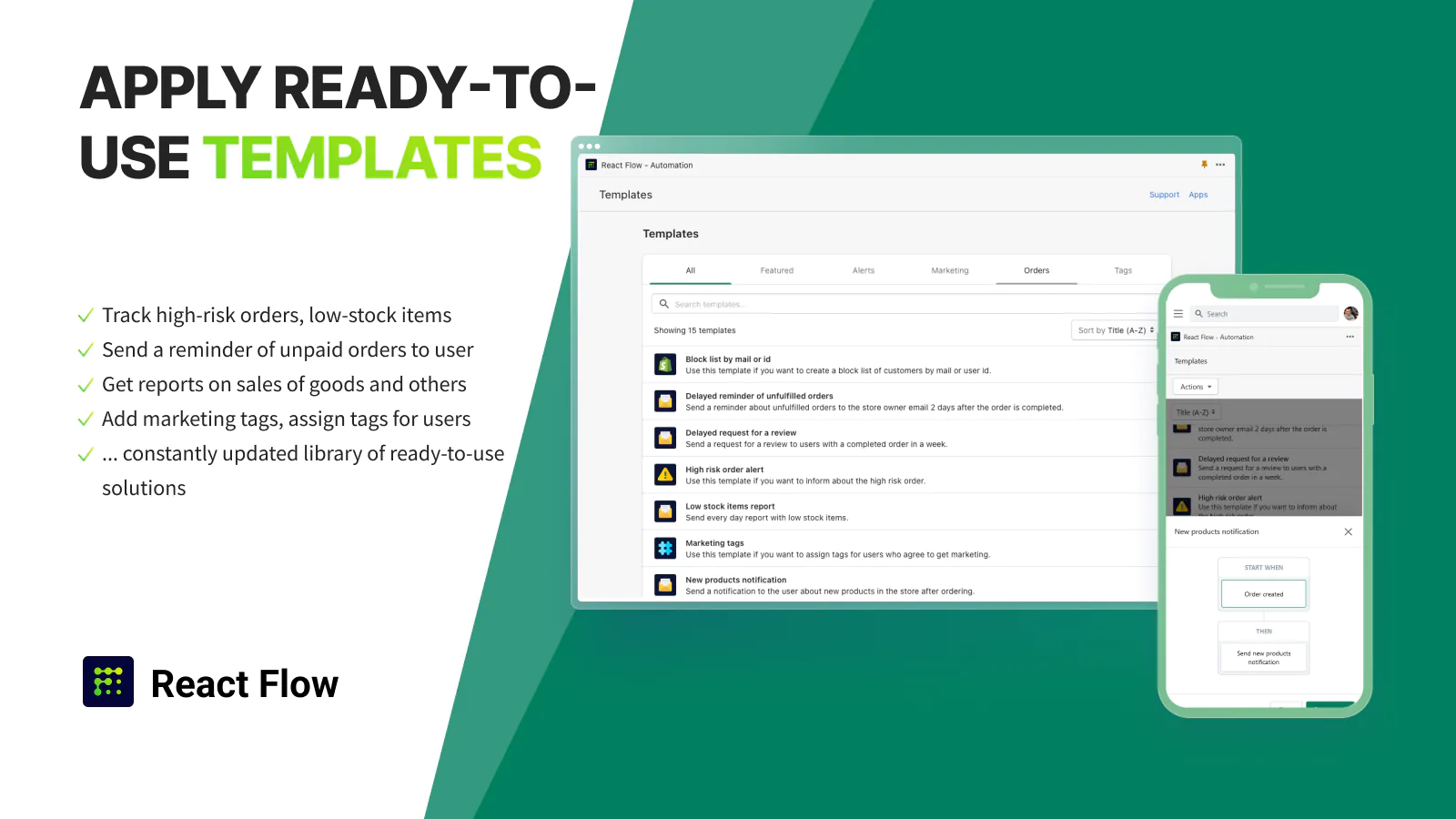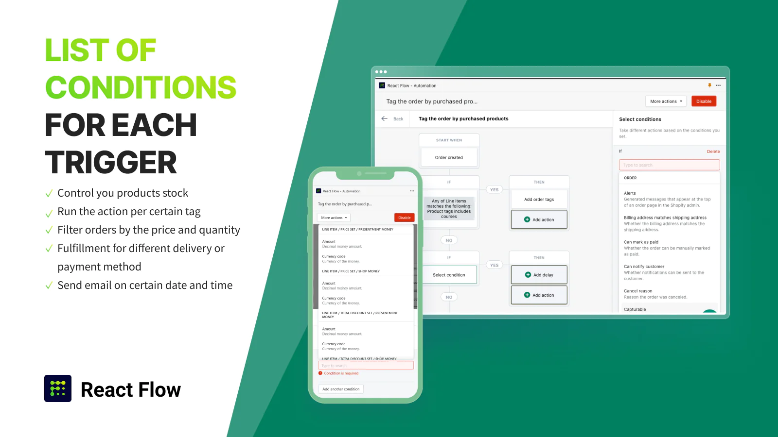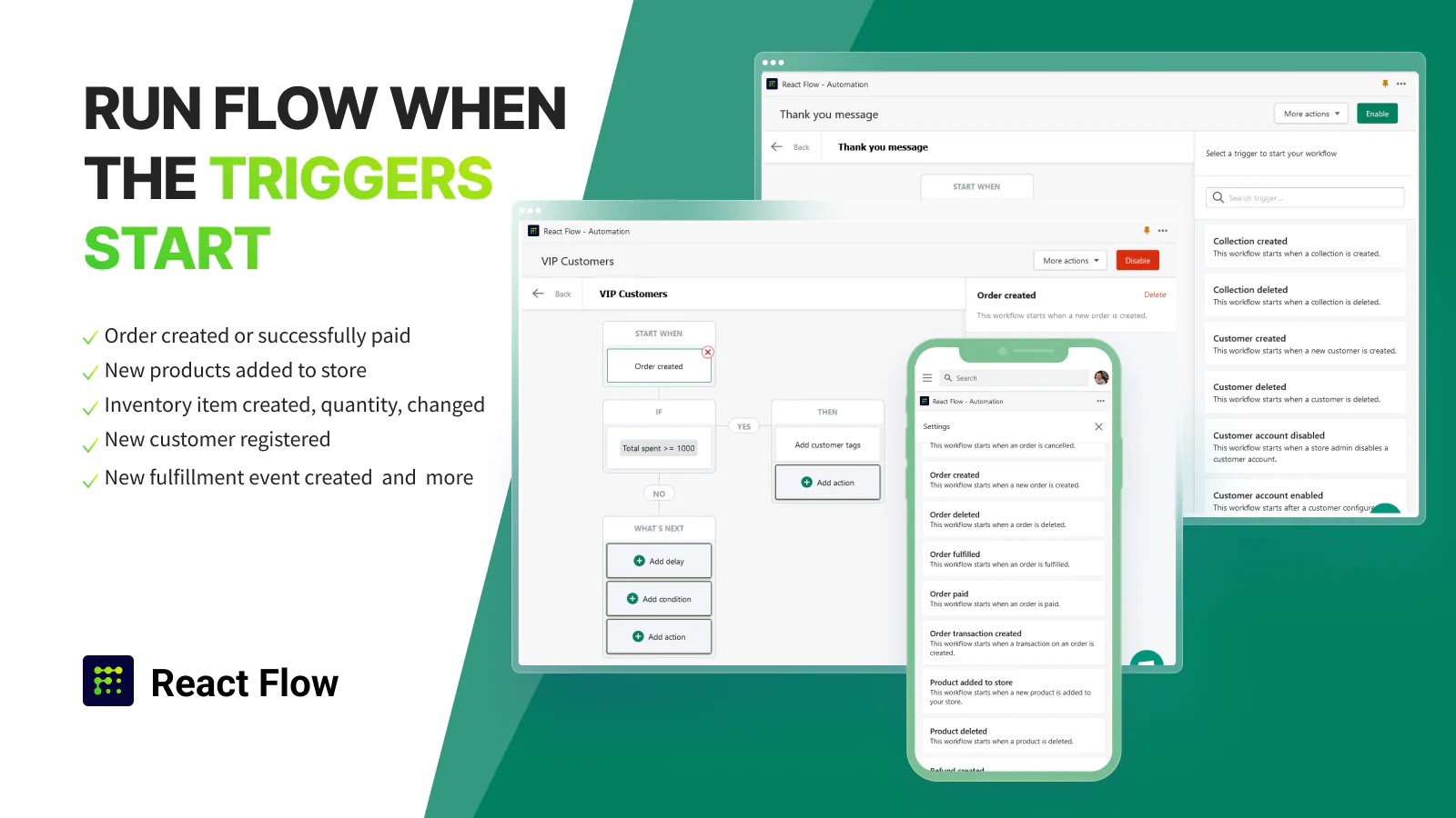 Delegate routine process to the app. Create flexible and effective tasks. Automate your Shopify flow with React Flow!