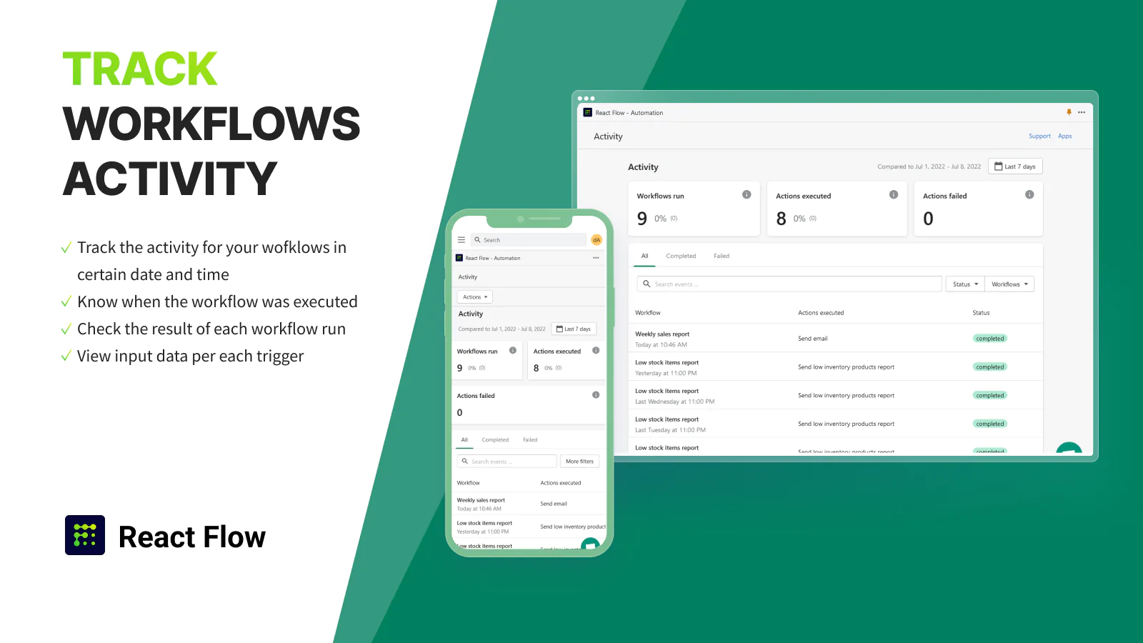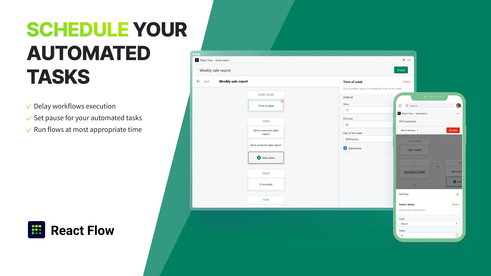 React Flow allows users to create scheduled workflows. It means that some actions will automatically be performed at the scheduled time and period. For example, you can set up a weekly sales report, send an email once weekly as a reminder, etc.