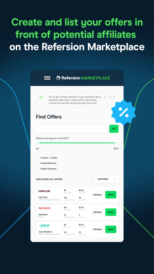 Every Refersion customer gets access to the Refersion Affiliate Marketplace, our rapidly growing network of qualified affiliates, influencers and content publishers ready to share your products. Promote your offer to affiliates and quickly grow your affiliate marketing program.