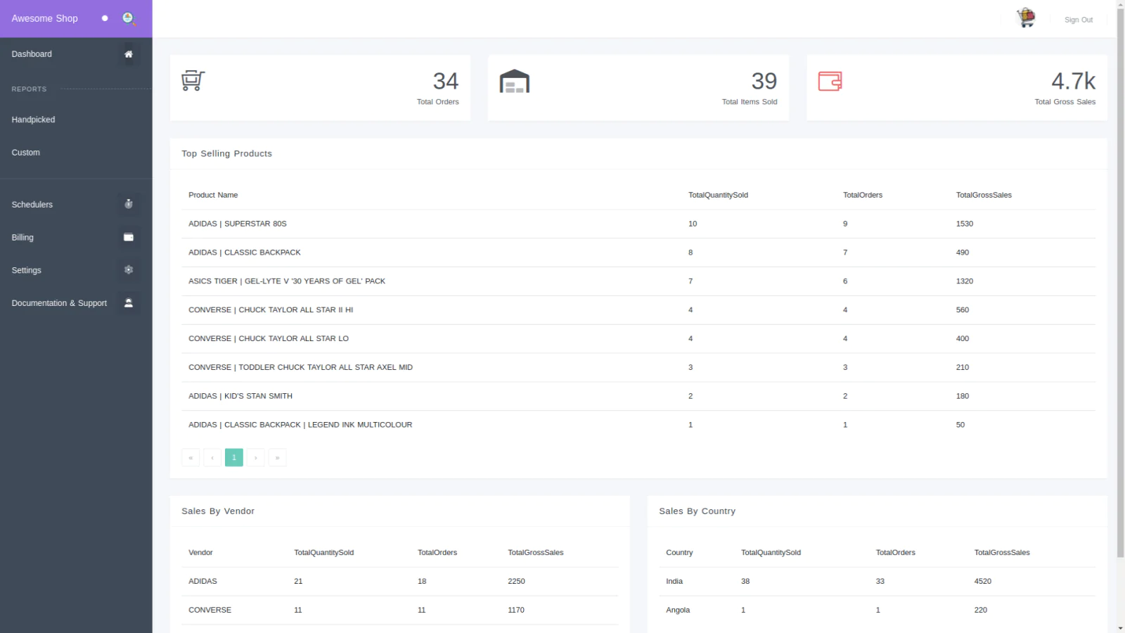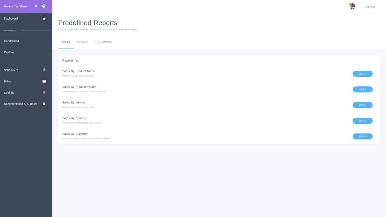 App is loaded with many predefined reports shopify merchants generally use like Best Selling Products, Best Selling Vendors, Sales By Country, Most valuable customers etc to name few.