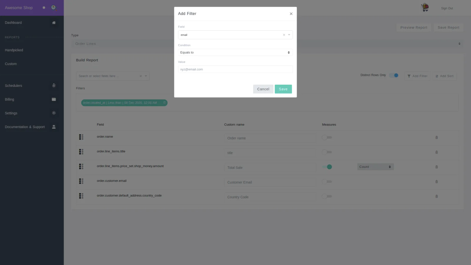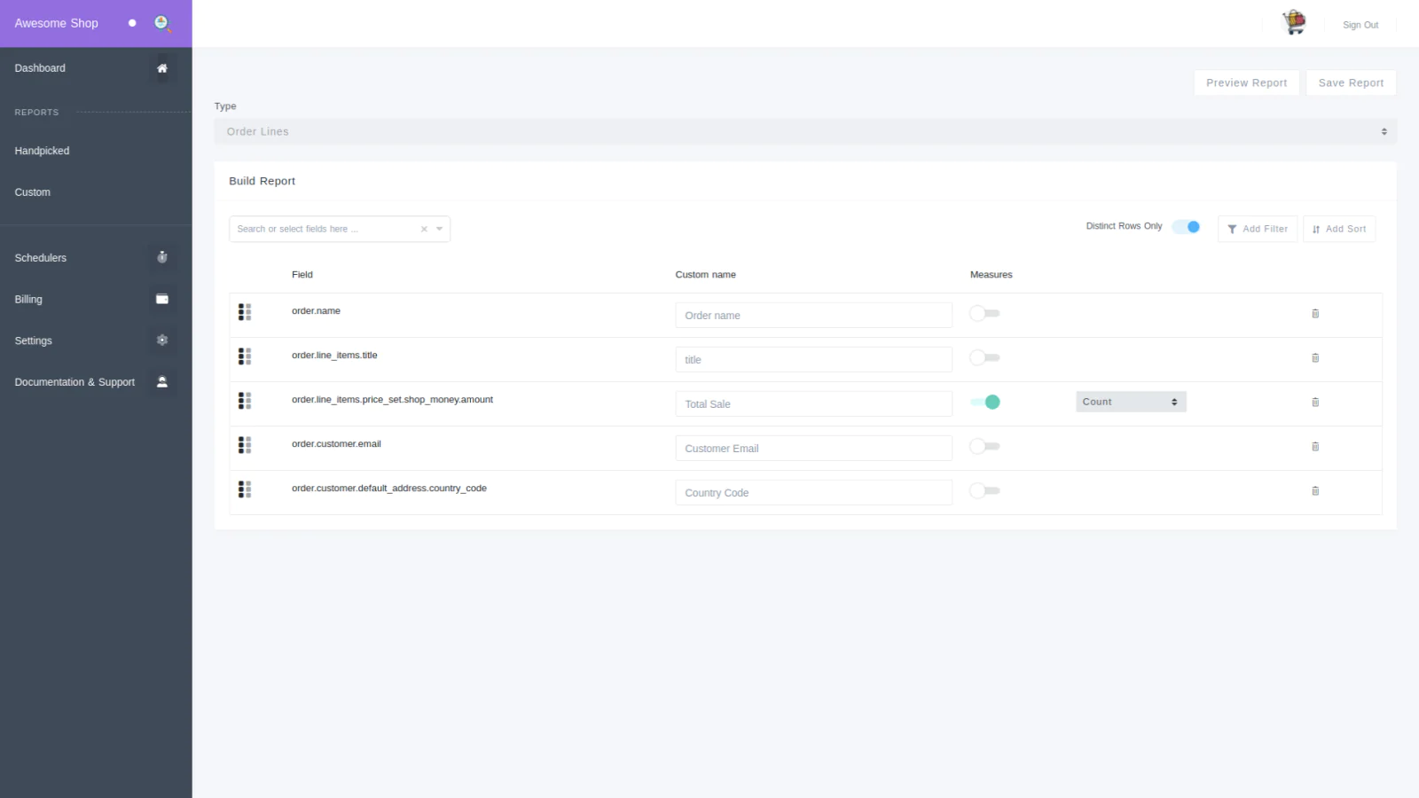 Make Custom reports on Shopify orders, products, inventory and customers easily. Make reports about your shopify orders, products, inventory and customers in a very easy and customizable way. Select any shopify data - order, line item, product, variant or customer attribute you might need on your report. Add filters for your output data. And sort result in any order you would like. ReportsZilla reports will generate the report for you in seconds!